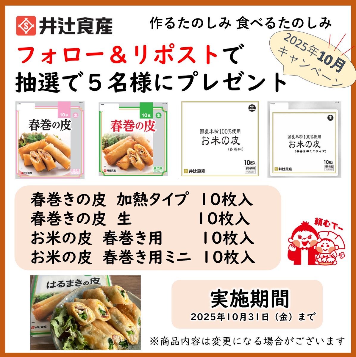 🥟餃子の皮の井辻食産🥟 秋も春巻きの皮であきまき🎁10月 春巻きの皮キャンペーン! 手作り春巻セット5名様にプレゼント! ☆応募方法 ①@itsujisyokusanをフォロー ②このポストをリポスト ☆締切10月31日 ☆当選した方にDMでお知らせ #井辻食産 #懸賞 #お米の皮 #あきまき #春巻きの皮 #キャンペーン pic.x.com/sVz9FJR76v