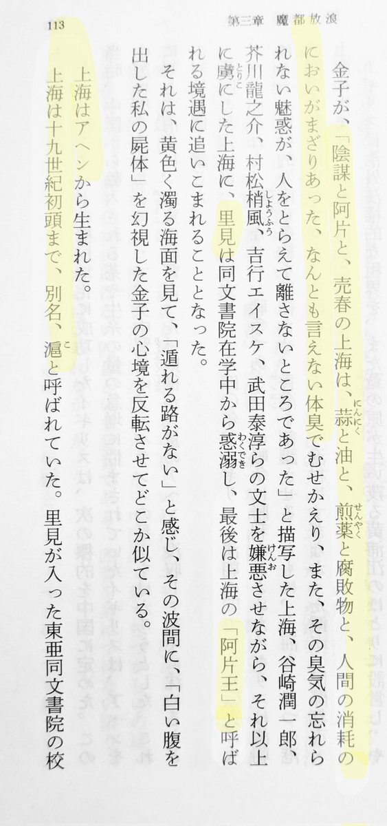 上海はアヘンから生まれた。19世紀初頭まで別名「滬こ」と呼ばれた。 陰謀と阿片と売春の上海は、ニンニクと油と煎薬と腐敗物と…なんとも言えない体臭…忘れられない魅惑… #昭和史 #近現代史 113p「阿片王」佐野眞一 pic.x.com/oqzP5j42lW