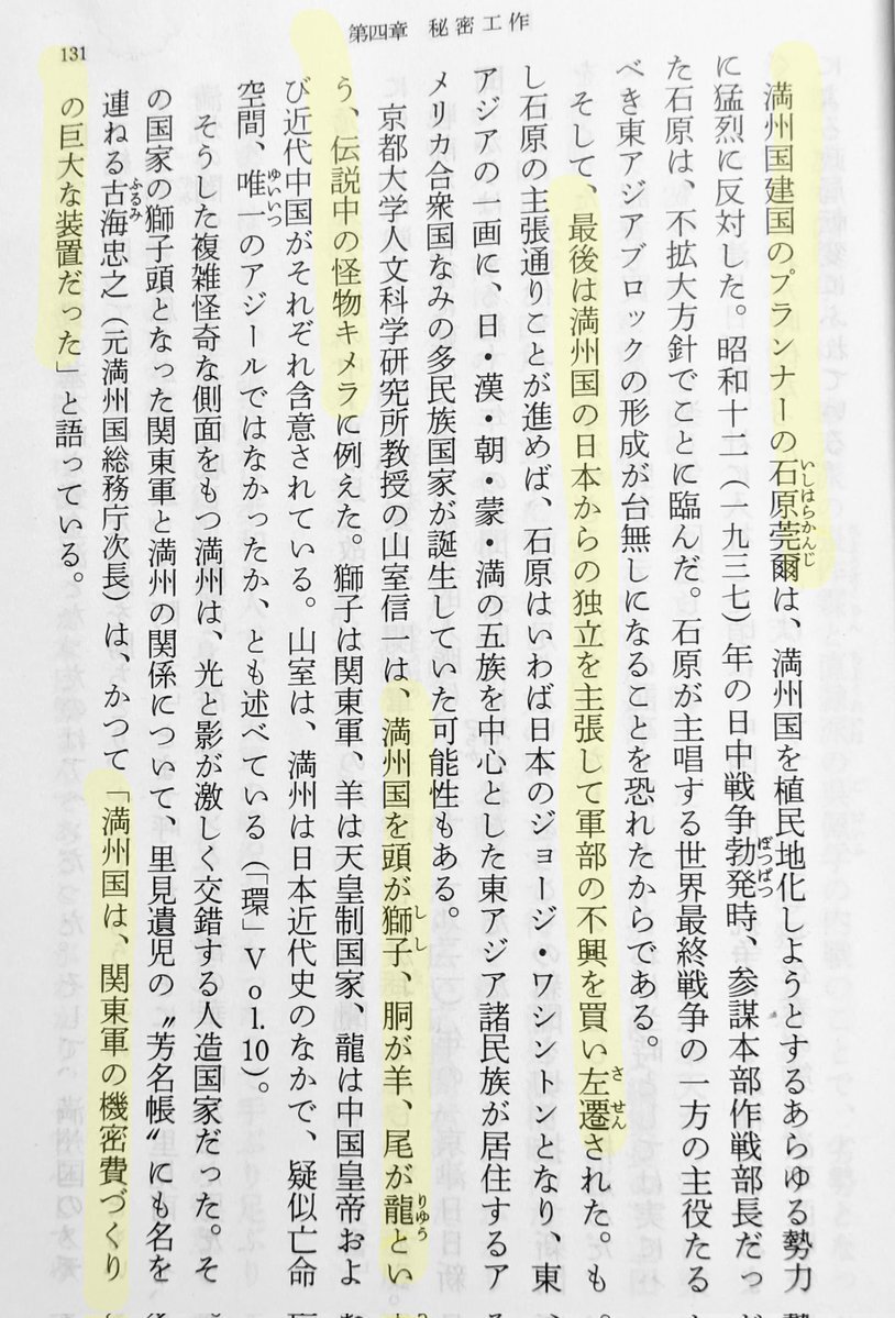 #満州国 を作った石原莞爾は、満州国の植民地化に猛反対した。満州国の日本からの独立を主張するも…左遷。 満州国は怪物キメラに例えられ…頭の獅子は関東軍、胴体の羊が天皇制、龍の尾は中国皇帝…人造国家。 満州国は関東軍の機密費を産む巨大な装置だった。131p #昭和史 pic.x.com/SjogtXTO17