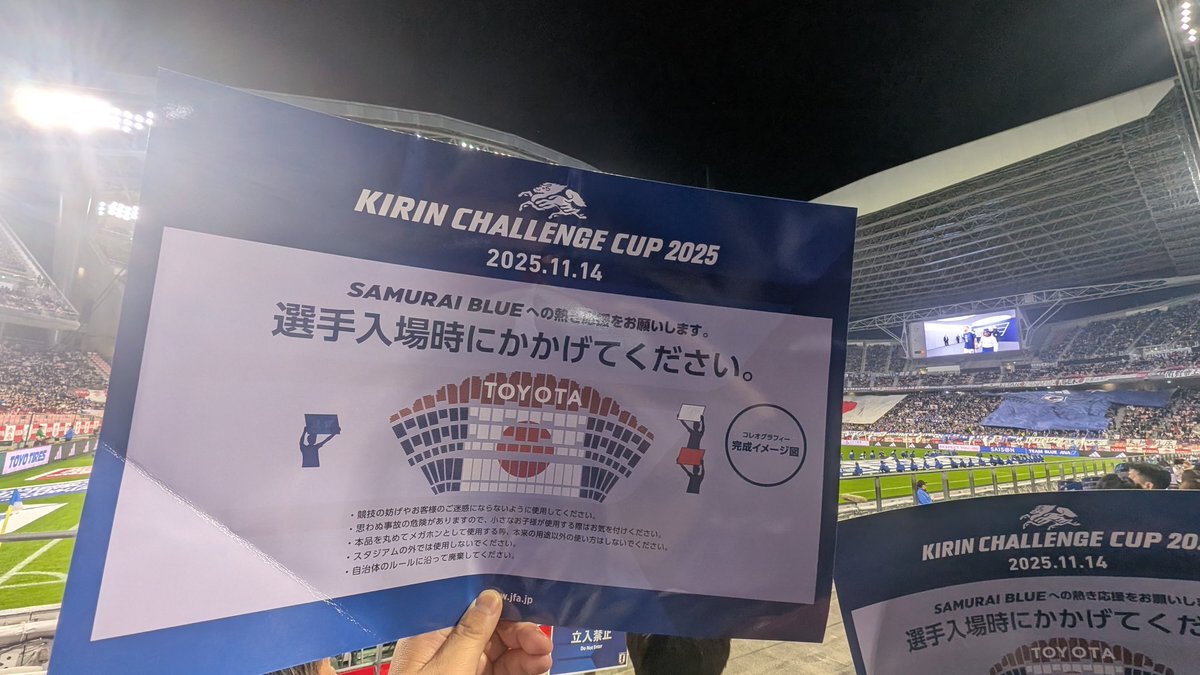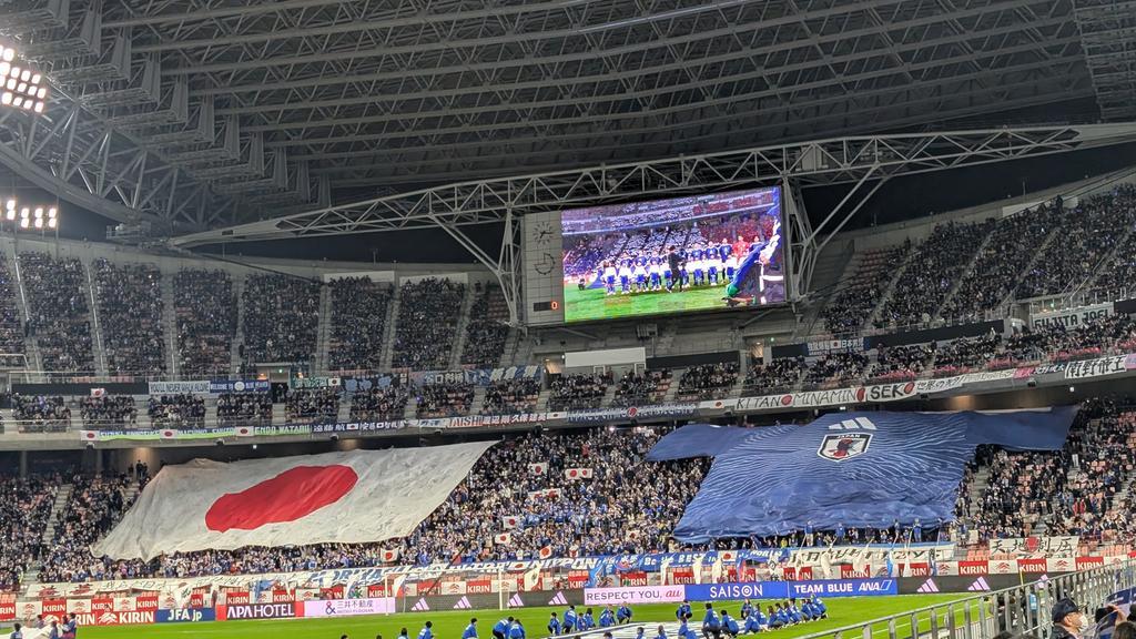 コレオ、綺麗にできていました。スタジアムのビジョンで確認しました。(うまく撮れなかったけど🤭) ゴール裏の雰囲気もgoodでした。 🏆️キリンチャレンジカップ 2025 11.14(金) 日本代表🇯🇵2-0ガーナ代表🇬🇭 🏟️豊田スタジアム #最高の景色 #SAMURAIBLUE #jfa #daihyo #サッカー日本代表 x.com/hama_no_dolphi…