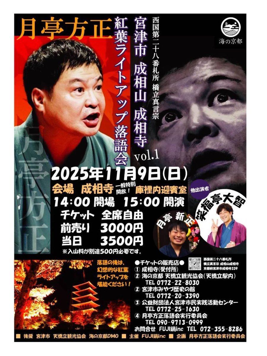【イベント】紅葉ライトアップ落語会 2025年11月9日(日) 14:00開場 前売り 3,000円/当日券3,500円 ※別途入山料500円 #月亭方正 さん他をお招きした落語会 《場所》成相寺様 nariaiji.jp 《お問い合わせ》FUJI鍋inc TEL:072-355-8286 instagram.com/nariaiji/p/DPs… #切り絵御朱印 pic.x.com/gdP0St68GH