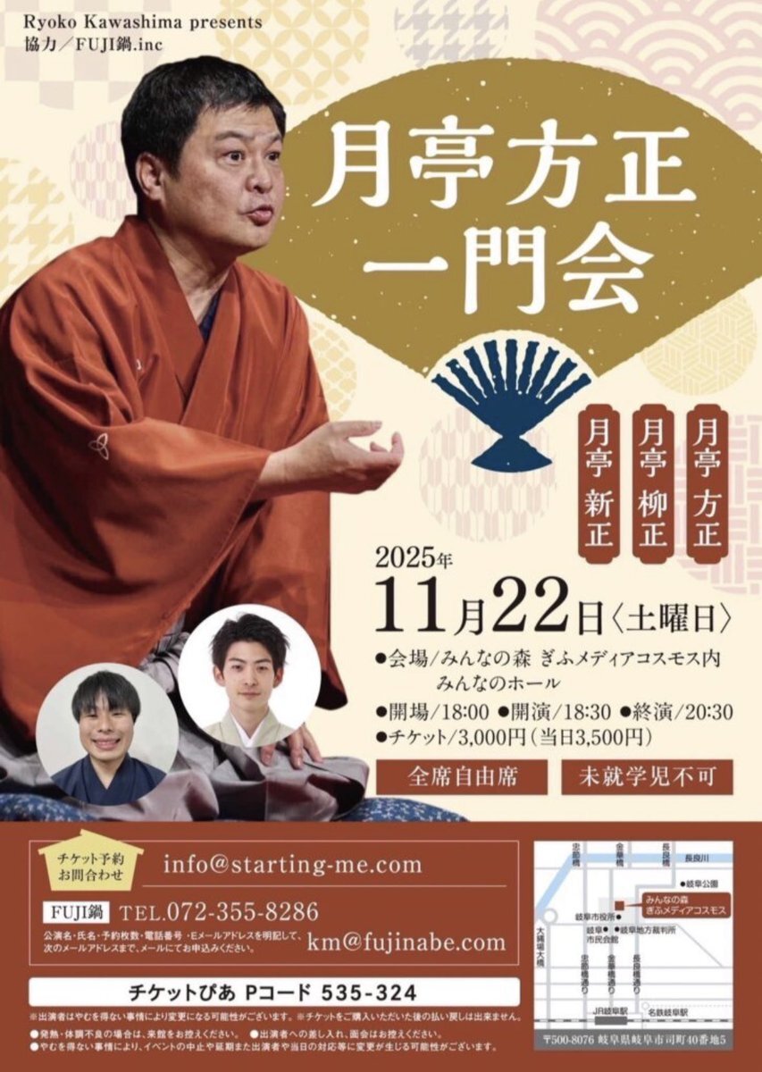 おはようございます! 🌸🌸 #月亭方正 🌸🌸 11月22日(土)18時開場 ぎふメディアコスモス 「月亭方正」さんの落語会を開催します🎉✨ 今年も司会を務めさせて頂きます🙏✨ ありがとうございます✨✨ 岐阜は落語の発祥の地やお💕 ぜひみんなで大笑いしましょ♪ 今日も一日 笑顔でゆっこー! pic.x.com/VmXIMDOvR9