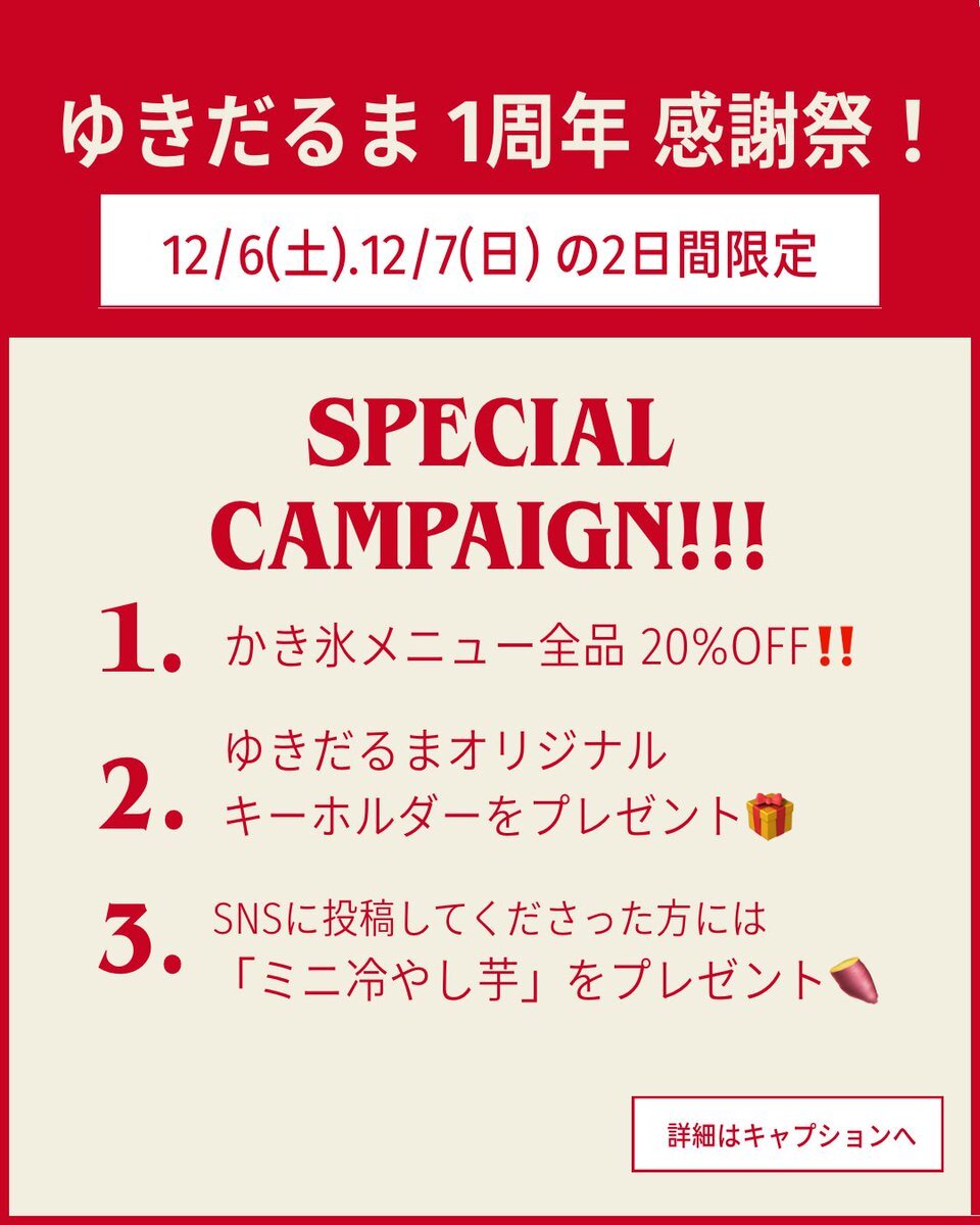 かき氷とお芋のお店【ゆきだるま】⛄🍧🍠 おかげさまで2025/12/5(金)で1周年を迎えます- ̗̀ 🎂 ̖́- ありがとうございます🙇‍♀️✨ それに伴い、日頃の感謝を込めて感謝祭を行います🎉 12/6(土)、12/7(日)の2日間限定‼️ 皆様のご来店を心よりお待ちしております! #月島 #ごーらー #氷活 #1周年イベント pic.x.com/gj9rh2xaAp