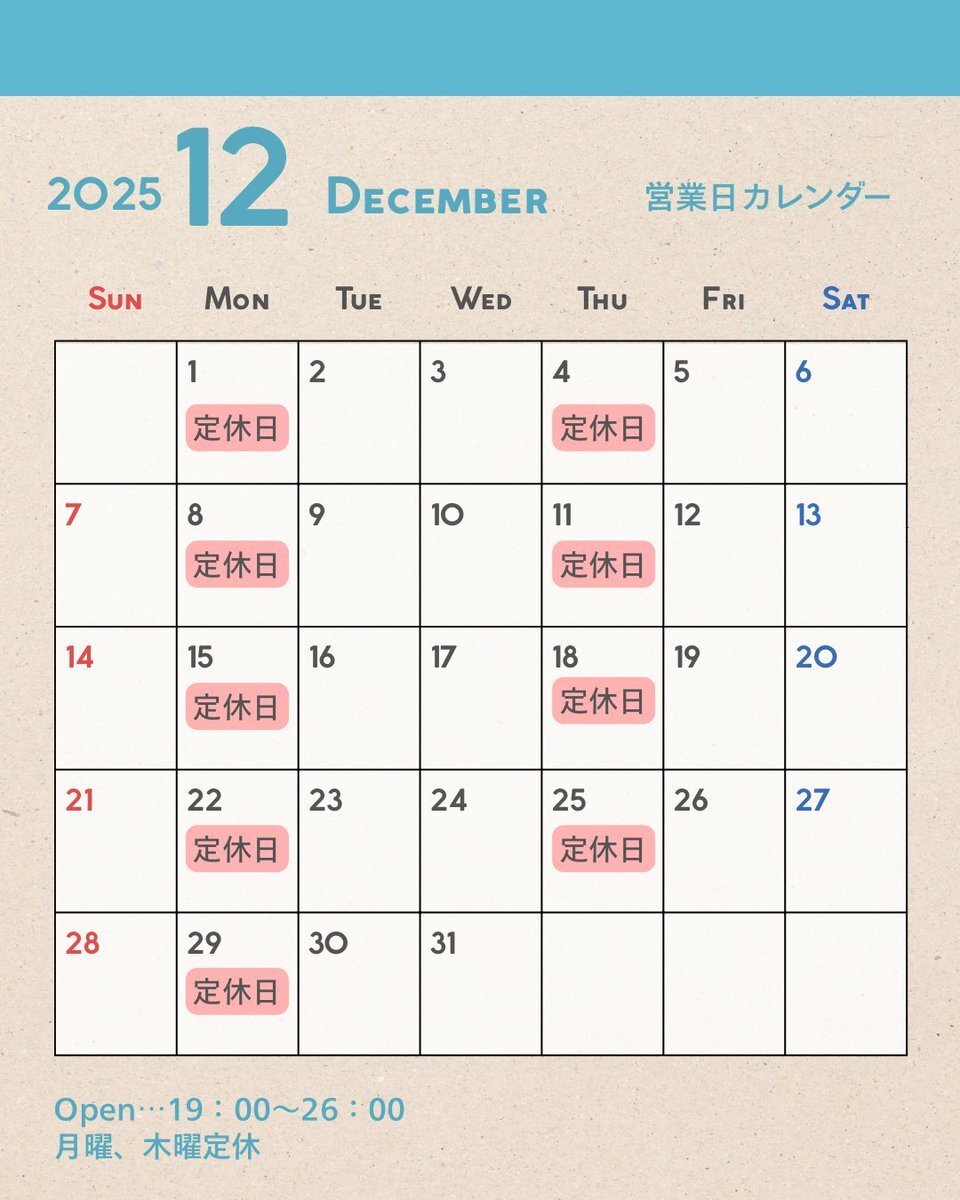 12月の営業カレンダーを更新しました 年末に向けて混みやすい時期なので来店の予定がある方は参考にしてください 12月もよろしくお願いします #勝どき #月島 #晴海 #barbiz #カジュアルバー #営業日 #営業カレンダー pic.x.com/62BkaPsgaK