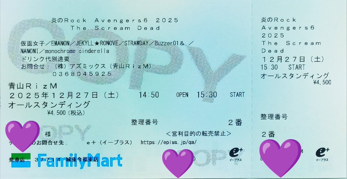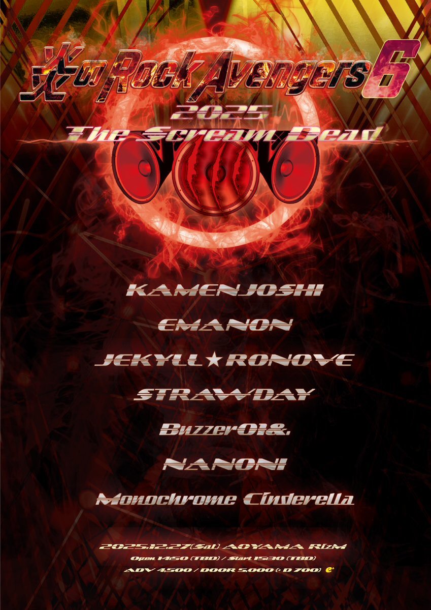 2025年12月27日(土) 『炎のRock Avengers6 2025 The Scream Dead』 📍青山RizM 🎫前売:4,500+D 700円 当日:5.000+D 700円 🎫Ticketはこちらから👇 ※チケット販売開始11月15日(土)12:00~ 🎫e+: eplus.jp/sf/detail/4435… 🎫tiget: tiget.net/events/443081