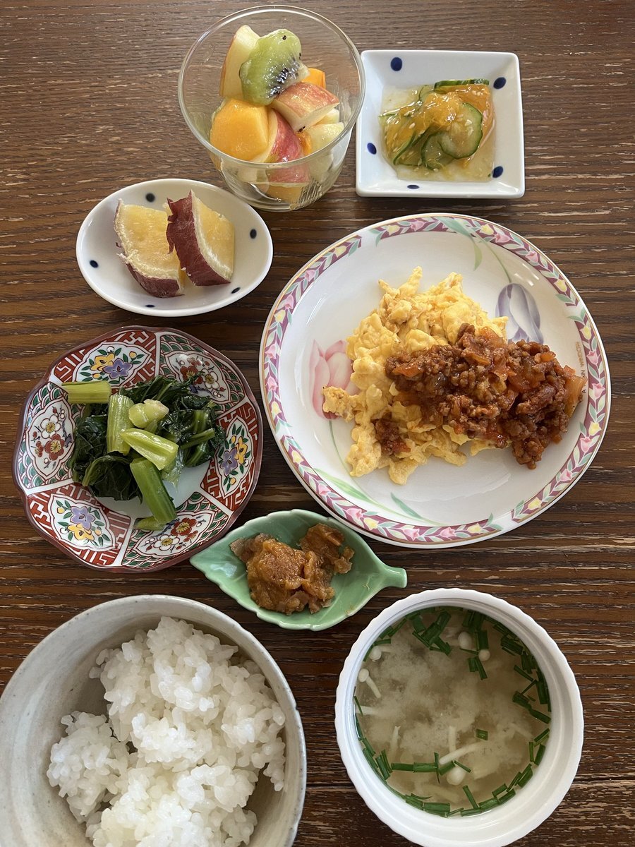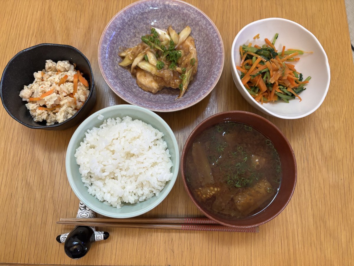 10月21日火曜日の朝ごはん ☆エビ入り炒り豆腐 ☆鶏むね肉と長ネギの照り焼き ☆大根葉と人参のナムル ☆焼きナスのお味噌汁 ☆ごはん むね肉はパサパサしやすいので米粉をまぶして焼いたらしっとり仕上がった。米粉、小麦粉より使いやすい #朝ごはん #おうちごはん pic.x.com/S0TGYniqGe