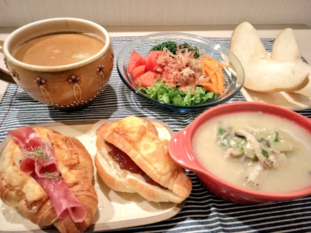 昨日はチーズクロワッサン🥐 ・生ハム ・いちごジャム🍓の2種類を用意したデス✨ 塩っぱさ&甘さ どちらも美味しかったデスー(*^_^*) #朝ごはん #チーズクロワッサン #コーヒー pic.x.com/xCyvTP7KTS