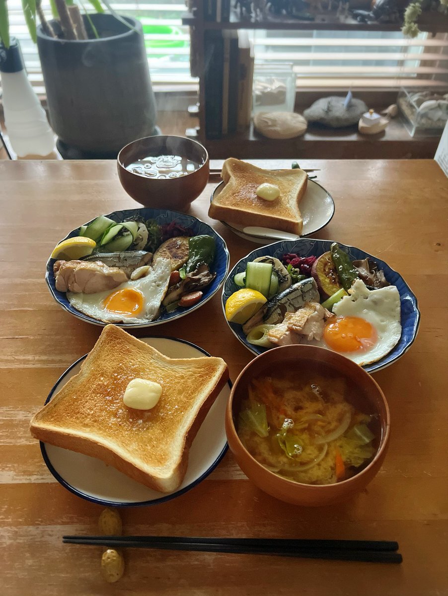 おはようフライデーございます 彼女と我が子からのリクエストにより久しぶりにバタートースト&お味噌汁。おかずは目玉焼き、焼いた鶏肉と野菜、秋刀魚オリーブオイル煮など 我が子、昨晩も深夜に怖い夢を見て起きました。またもや隕石が落下して恐竜が絶滅したとのことです #朝ごはん pic.x.com/mcrvBHlKeM