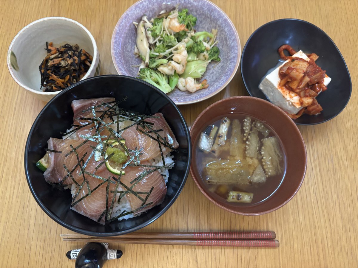 10月24日金曜日の朝ごはん ☆ひじき煮 ☆海老ときのこブロッコリーのオイスターソース炒め ☆イカキムチのせ冷奴 ☆長ネギと焼きナスのお味噌汁 ☆ブリの漬け丼 今日から無印良品週間。初日は混むので休み明けを狙うわ😊 #朝ごはん #おうちごはん pic.x.com/1WvrGrXPKb