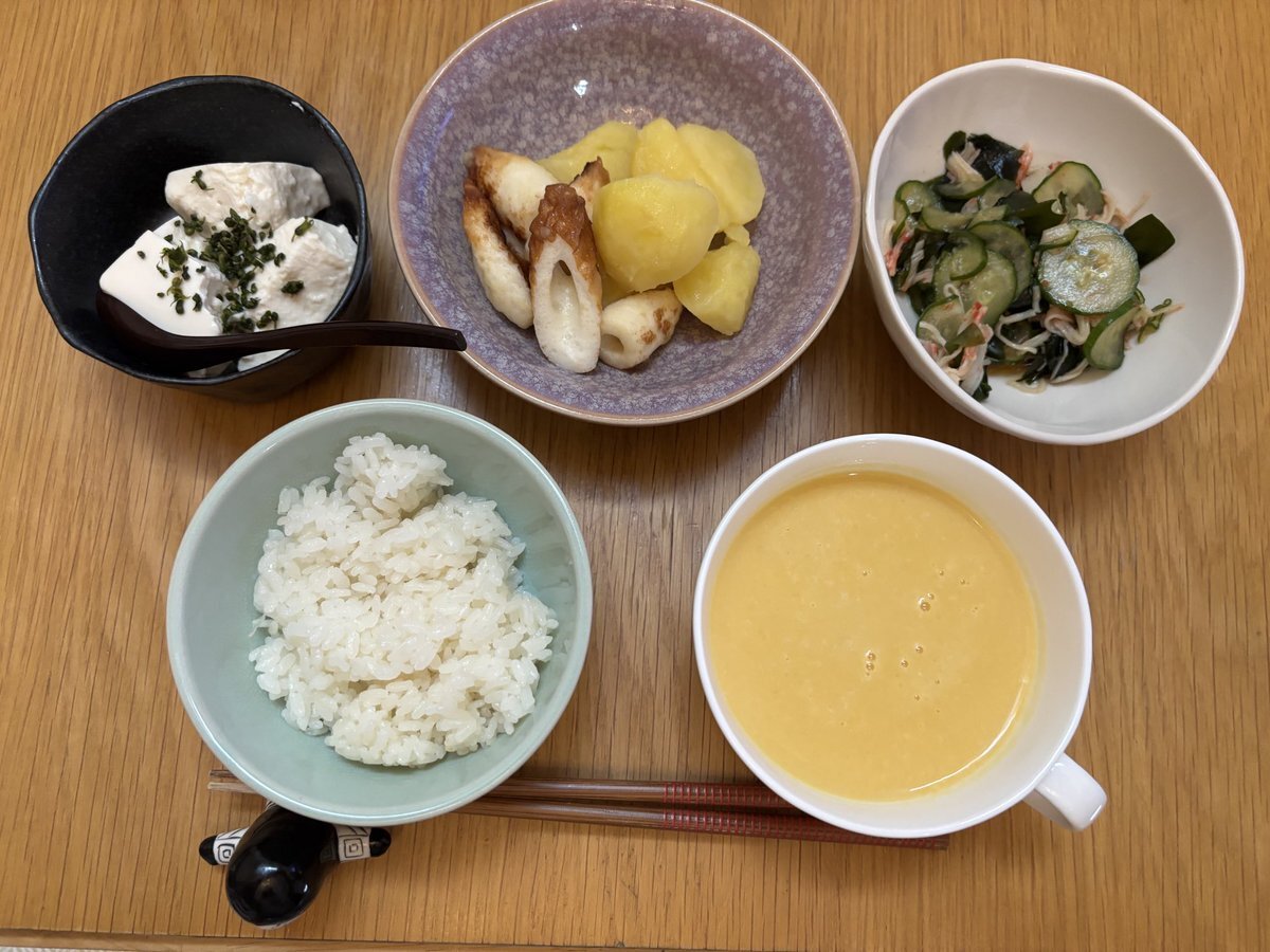 10月23日木曜日の朝ごはん ☆冷奴 しその実のせ ☆ちくわとじゃがいものバター煮 ☆カニカマときゅうりワカメの酢の物 ☆バターナッツかぼちゃのスープ ☆ごはん バターナッツかぼちゃはフライパンで両面弱火で焼いて甘さを十分引き出した。美味しい😋#朝ごはん #おうちごはん pic.x.com/UEs3rJ8oFs