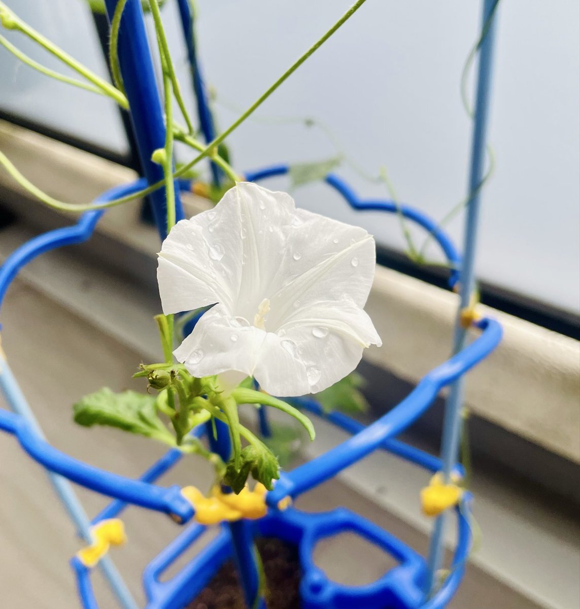 家のペットボトル栽培で2022年から咲き続ける朝顔の種を玄関前のプランターに植えてみたらハダニついて駆除したけどしおしおになっちゃって。これはもう枯れるんだろうなと思っていたら蕾が出来てて涙が出ました #朝顔 pic.x.com/W7NS6GbvBl