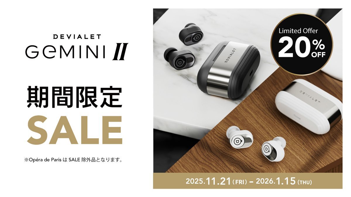 #期間限定セール #Devialet 🎧✨ 🎉 Devialet GEMINI II が期間限定で 20%OFF! 🎉 圧倒的な音響技術のフラッグシップ完全ワイヤレスイヤホン GEMINI II が、特別価格で手に入る大チャンス! ⏰ セール期間 2025年11月21日(金)~ 2026年1月15日(木) この期間だけの 20%OFF。 pic.x.com/tPSL1EURXg