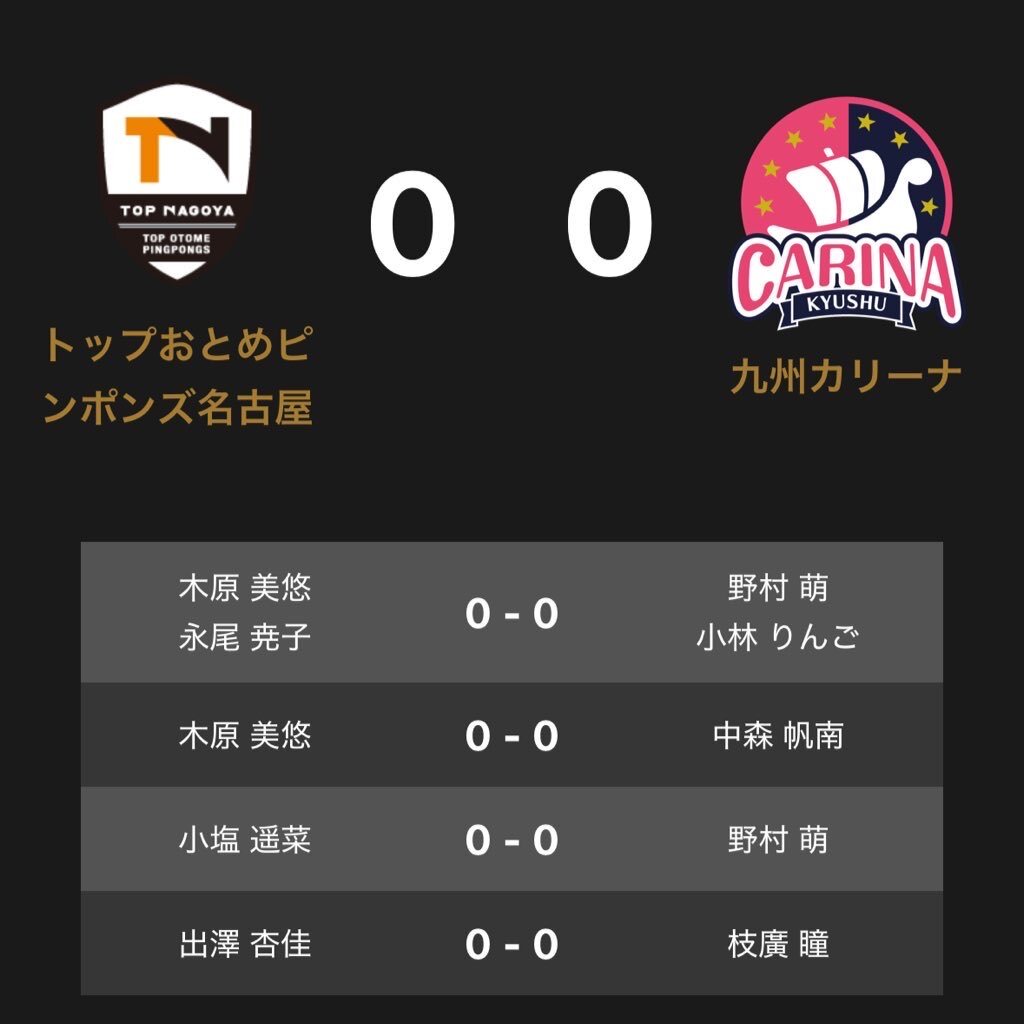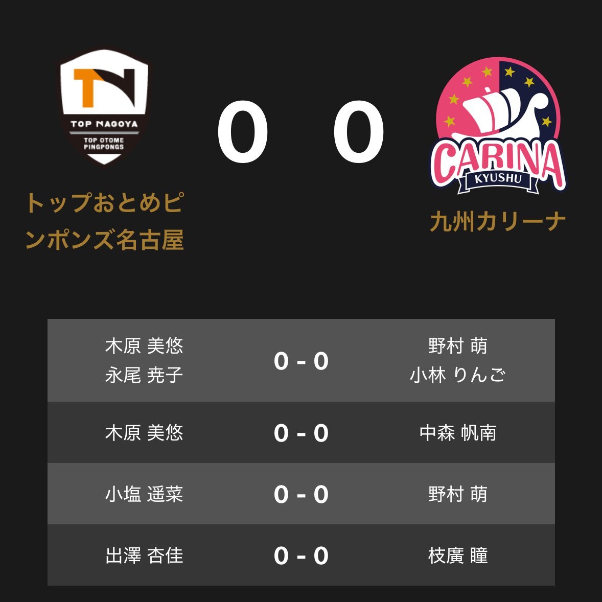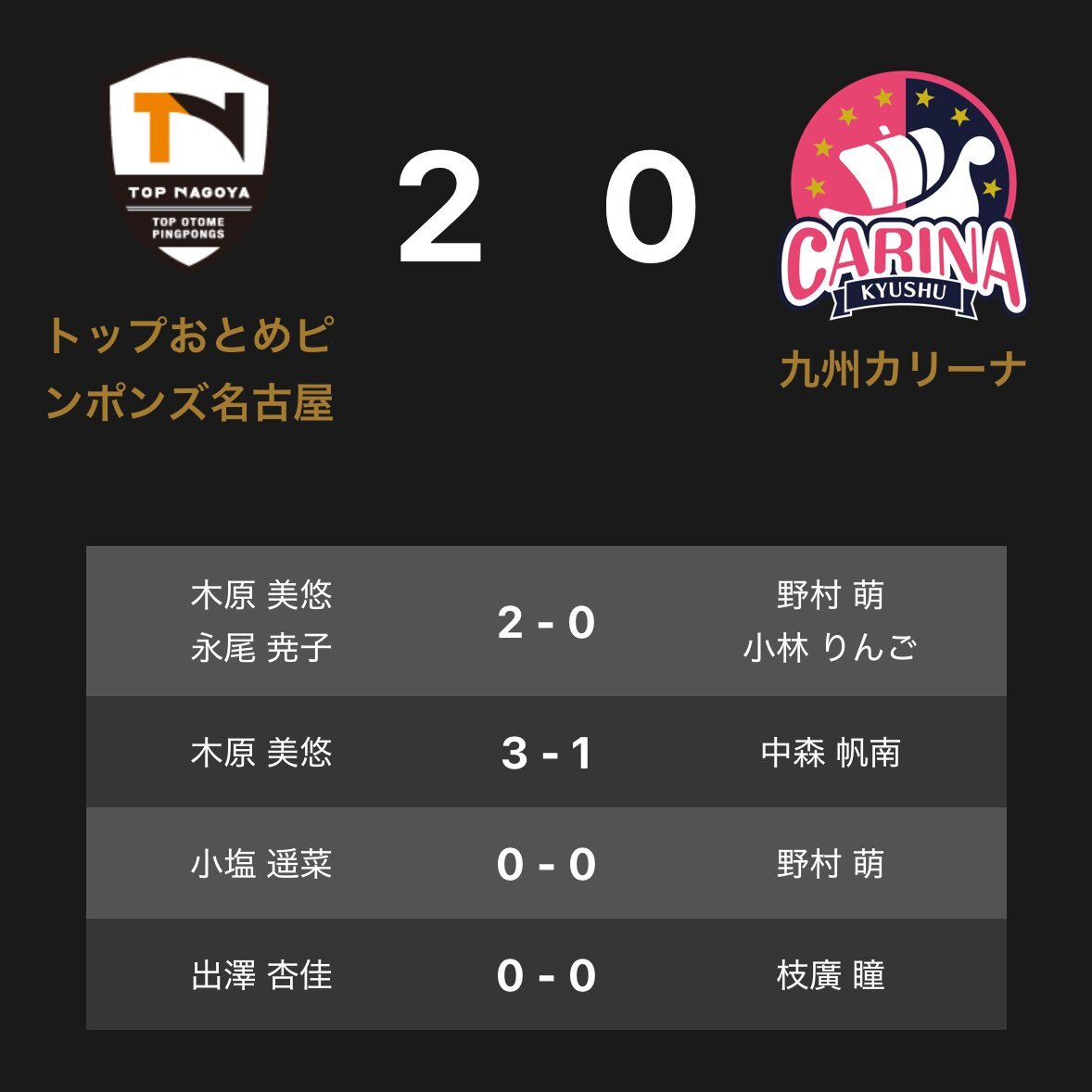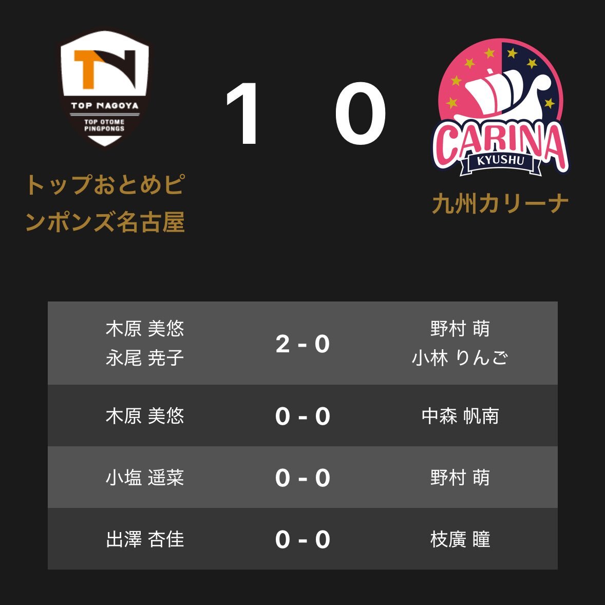 . 🏓試合結果🏓 #トップ名古屋 1-0 九州カリーナ 1️⃣ #木原美悠 #永尾尭子 ペア 2-0 野村・小林ペア 変則ダブルスとの対戦になりどのセットも接戦となりましたがしっかりと打ちきり見事勝利✨ 2番は木原選手が1番に続いての登場です🔥 #頑張れトップ名古屋 #Tリーグ pic.x.com/4Ldq4ZUx02
