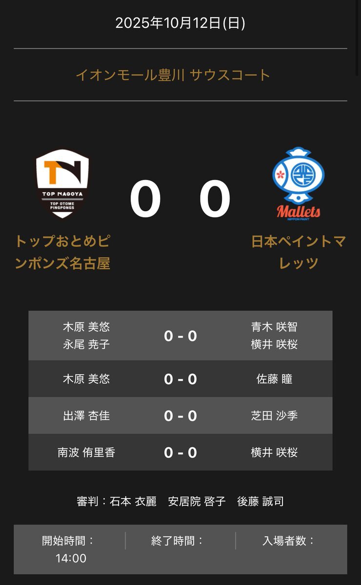 🏓 #ノジマTリーグ 2025-2026シーズン 🗓 10月12日(日) 14:00 📍イオンモール豊川 サウスコート #トップおとめピンポンズ名古屋 vs #日本ペイントマレッツ 間もなく試合が始まります✨️ 第1マッチは #木原美悠/#永尾尭子 - #青木咲智/#横井咲桜 です! #トップおとめピンポンズ名古屋 pic.x.com/3oyGRL3pyB