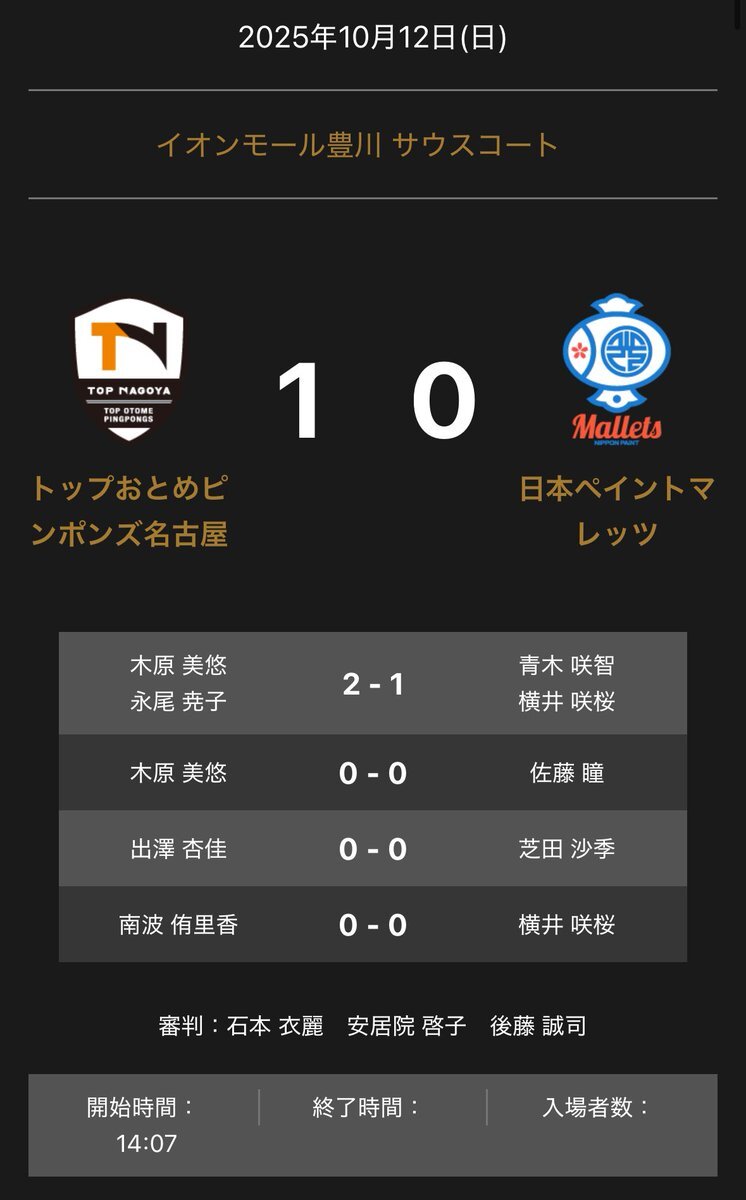 . 🏓試合結果🏓 #トップ名古屋 1-0 日本ペイントマレッツ 1️⃣ #木原美悠 #永尾尭子 ペア 2-1 青木・横井ペア 負けていた1セット目を挽回して勝利し、2人の強烈なフォアハンドが炸裂しゲームオールを押し切りました🙌 2番は木原選手の登場です🔥 #頑張れトップ名古屋 #Tリーグ #イオンモール豊川 pic.x.com/XKIQbVrSE5