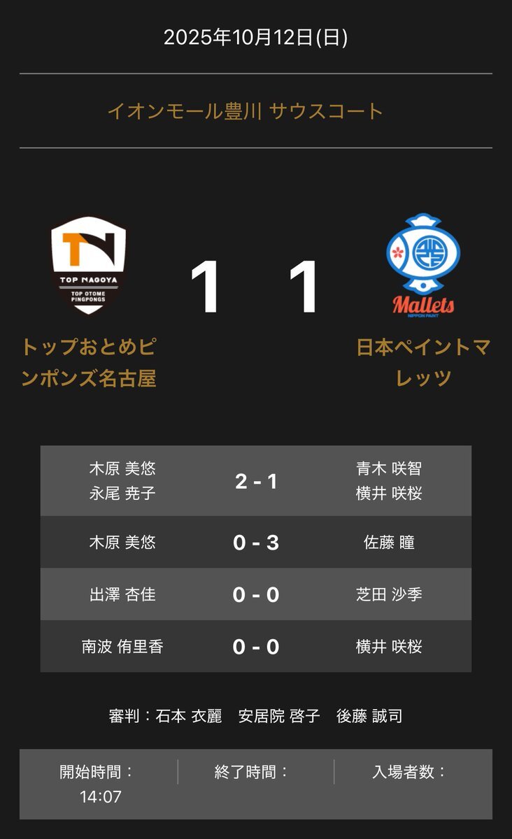 🏓 #ノジマTリーグ 2025-2026シーズン 🗓 10月12日(日) 14:00 📍イオンモール豊川 サウスコート #トップおとめピンポンズ名古屋 1-1 #日本ペイントマレッツ 第2マッチは #佐藤瞳が勝利しました✨️ #木原美悠 0-3 #佐藤瞳 10-11/7-11/8-11 第3マッチは #出澤杏佳 - #芝田沙季 です! pic.x.com/t0adDxVTgE