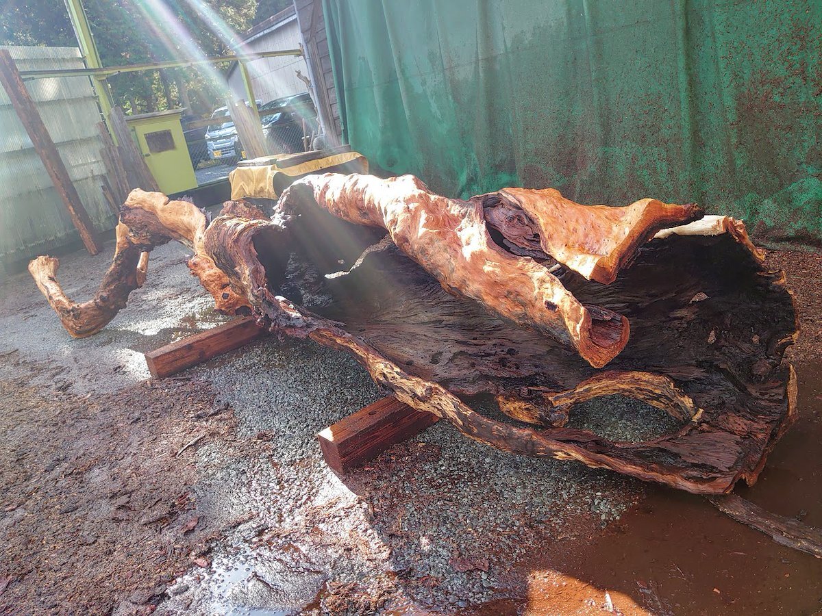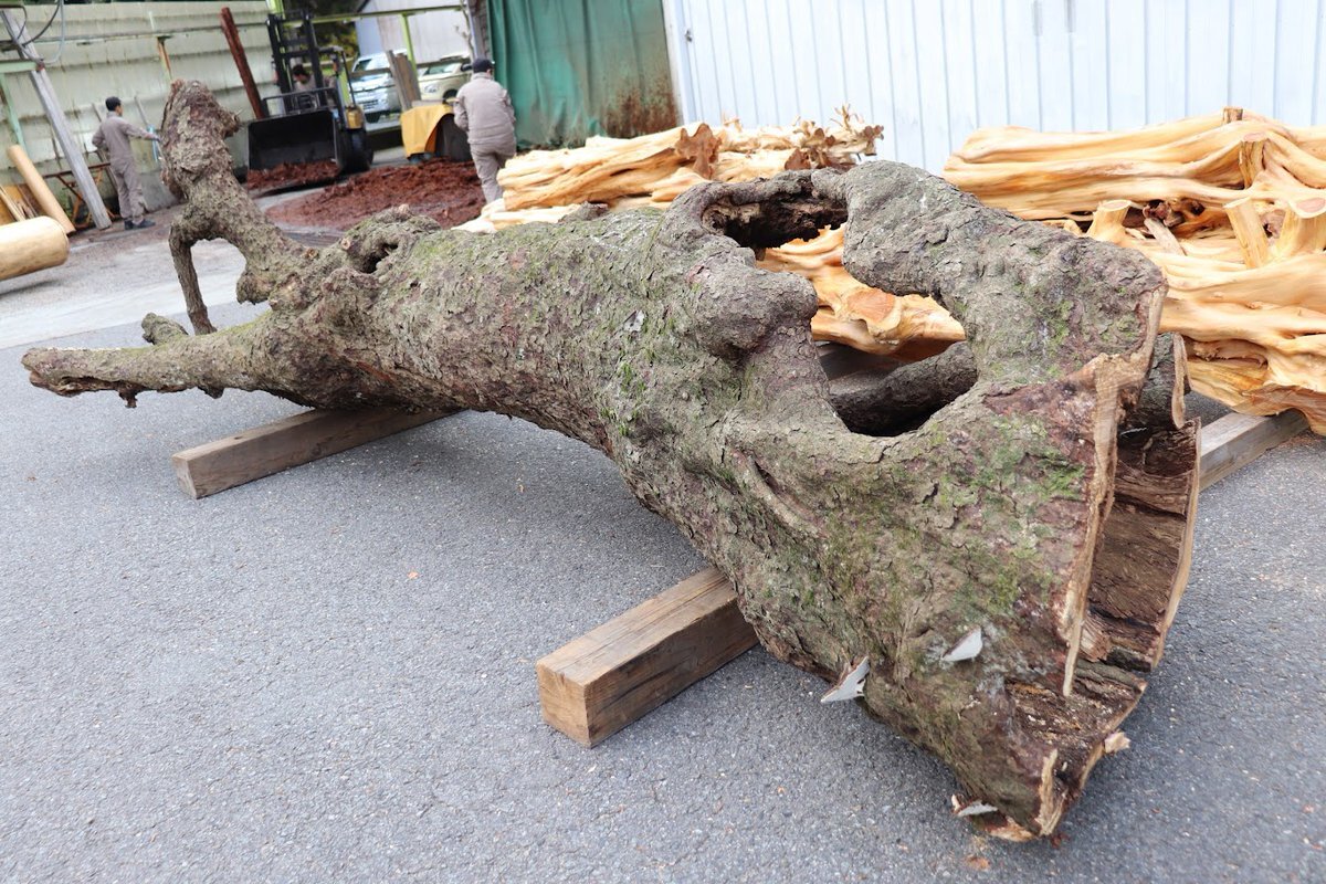 桜の自然木の皮むきが完了していました🪵 皮付きとはまた違った雰囲気がありますね🤔 これから外と木材倉庫内で乾燥させていきます #木材 #木工 #woodworking #インテリア #木のある暮らし #徳田銘木 #企業公式つぶやき部 pic.x.com/LTbyEzFrzM