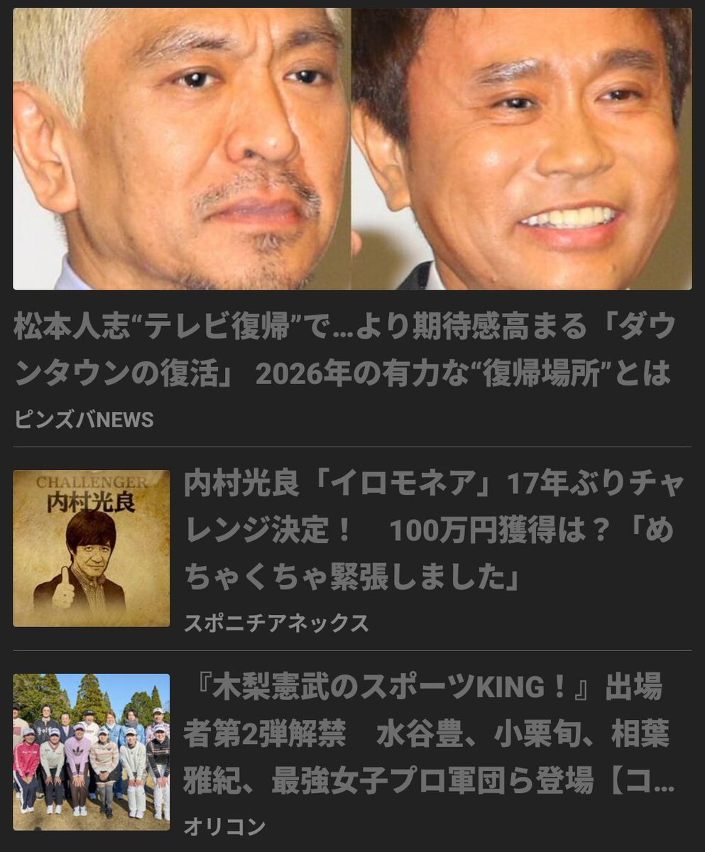 今Yahooの芸能記事見たら、ダウンタウン、ウッチャンナンチャン、とんねるずがトップに並んでいたの熱すぎる😳🔥✨ #ダウンタウン #松本人志 #浜田雅功 #内村光良(#ウッチャンナンチャン) #木梨憲武(#とんねるず) pic.x.com/3xtIE1oxyp