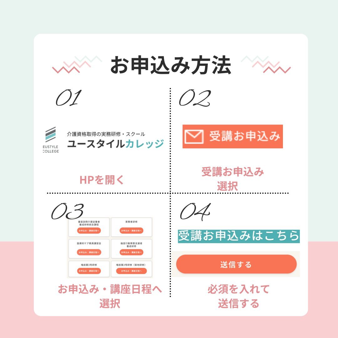 介護資格スクール「ユースタイルカレッジ」の お申し込み方法をご案内いたします。 ①HP(college.eustylelab.co.jp)へ ②『受講お申込み』を選択 ③希望講座の『お申込み・講座日程へ』を選択 ④日程を確認し、必須を入力して送信! #介護 #ユースタイルカレッジ #未経験 pic.x.com/EGxxYwuaqy