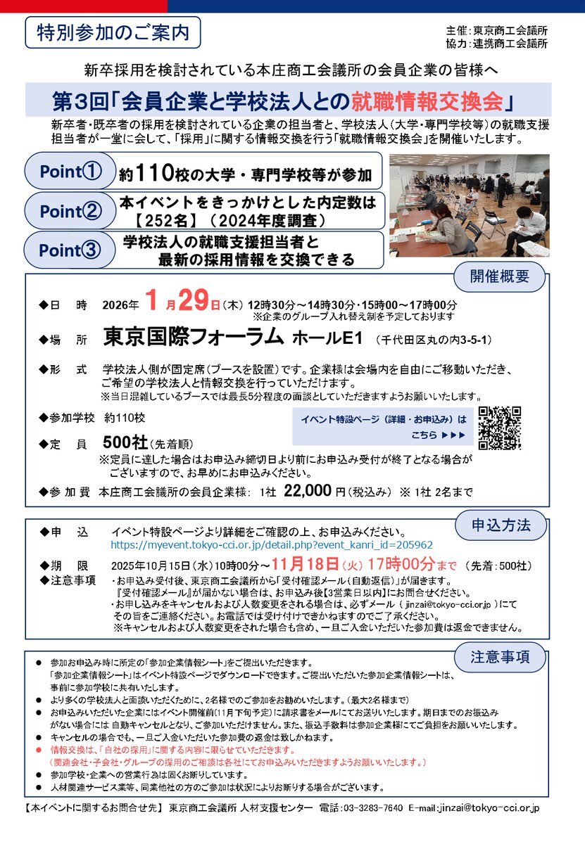 第3回「会員企業と学校法人との就職情報交換会」のご案内です📢 日時:2026年1/29(木) 12:30~14:30  15:00~17:00 会場:東京国際フォーラム ホールE1 詳細・申し込みはこちら👉honjocci.or.jp/info/2025/10/r… #本庄商工会議所 #本庄市 #本庄 #埼玉県 #埼玉 #就職 #就職活動 #採用 #情報交換 #支援 pic.x.com/XvKFDWa0Te