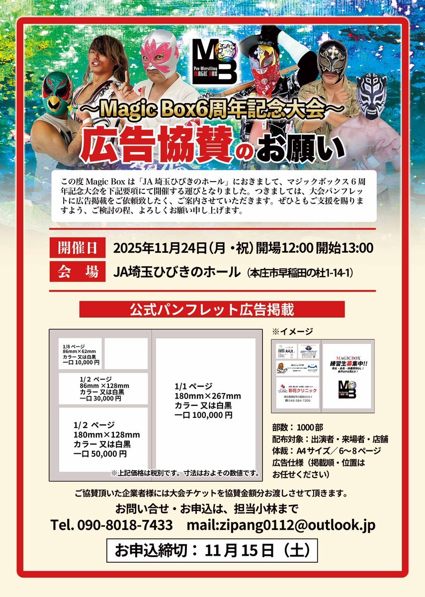 【広告協賛のお願い】 時下、ますますご清栄のこととお慶び申し上げます。 MagicBoxは6周年記念大会を開催する運びとなりました。 よって大会パンフレットの広告掲載を募集したく、ご案内致します。ぜひともご支援を賜りますよう、ご検討の程宜しくお願い申し上げます。 #mbpw #協賛募集 #本庄市 pic.x.com/6oPlY8HeqK