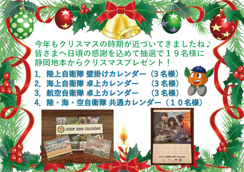 【#本部】 静岡地本クリスマスプレゼント企画にたくさんご応募いただき、ありがとうございました‼️ また、当選された方おめでとうございます😆🎉 厳正な抽選の結果、当選者にはDMを送らせていただきました。 不定期ではありますが、今後も #プレゼント企画 を実施します‼️ #自衛隊 #静岡地本 x.com/Shizuoka_PCO/s…