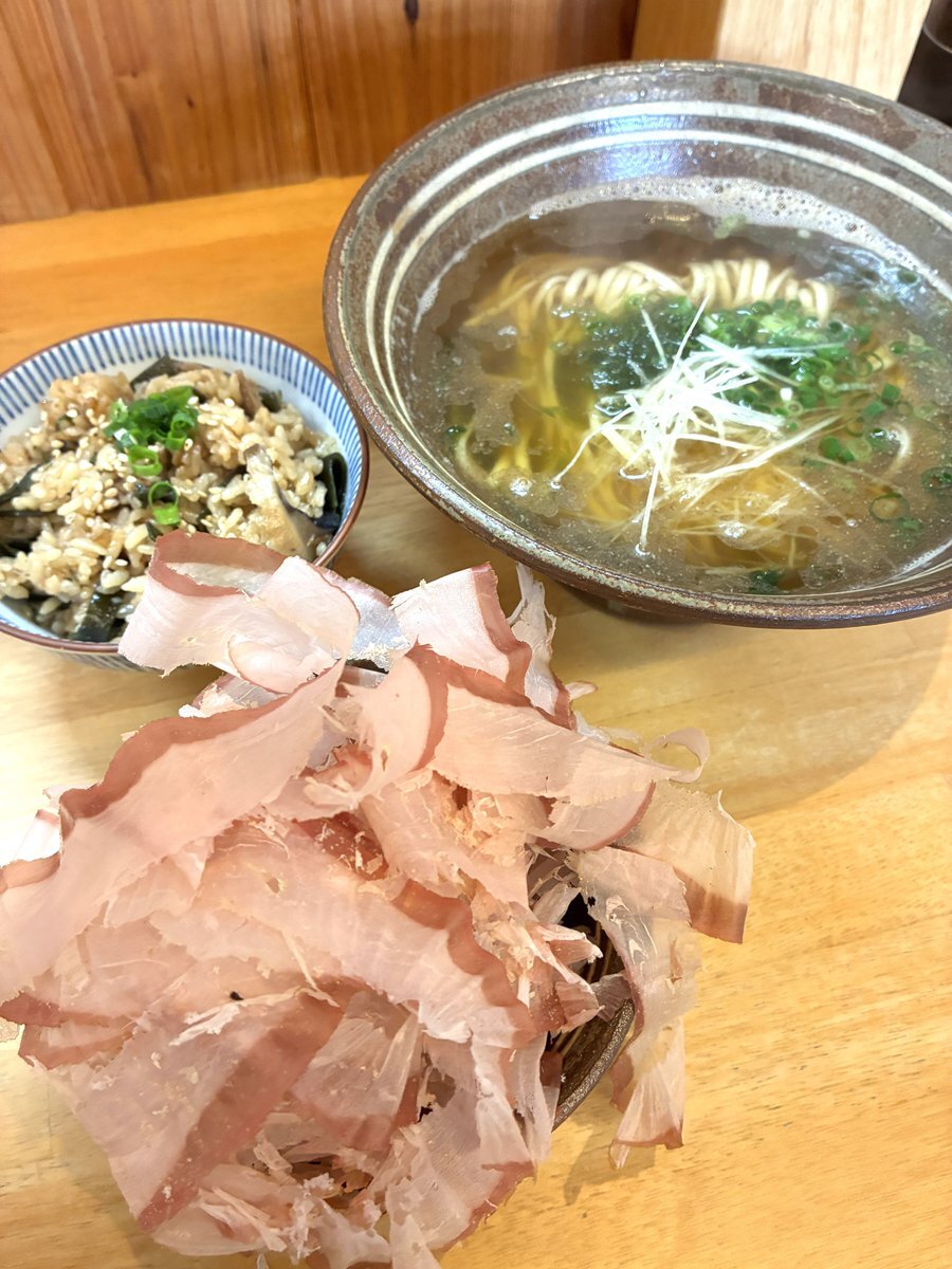 おかかそば¥780 ジューシー¥320 鰹節どーーーん🐟1口摘むと懐かしき昔の平和通りの香り😊出汁は沖縄そばというより魚粉系ラーメンに近いかな🍜しっかりとした奥行きある旨味だからライス🍚でもイイな😋 #沖縄そば #本部 #自家製麺沖縄そば海と麦と #海と麦と pic.x.com/YvmdTjMmDG