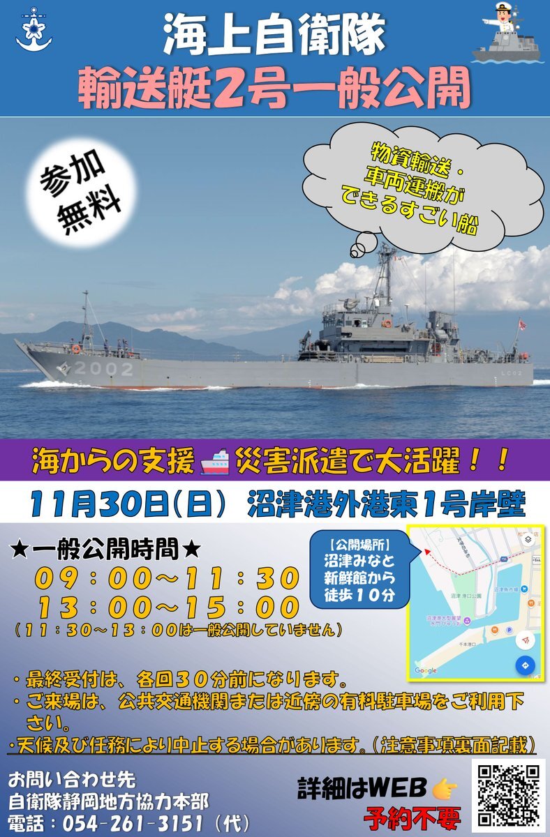 【#本部】 いよいよ今週末‼️ 輸送艇2号一般公開⚓️ 予約不要!見学無料! どなたでも艇内もご覧いただけます 場所は「沼津港外港東1号岸壁」で、沼津みなと新鮮館から徒歩約8分です。 お待ちしております😌 #沼津港 #沼津港外港 #海上自衛隊 #輸送艇2号 #一般公開 #静岡地本 pic.x.com/DKh8yDrK76 x.com/Shizuoka_PCO/s…