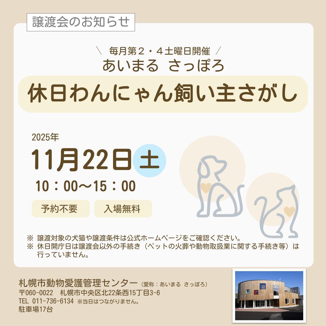 今週末11月22日(土)は「休日わんにゃん飼い主さがし」です!犬猫の飼育をお考えの方は、ぜひセンターからの譲渡をご検討ください🐶🐱📷 #札幌市 #犬 #猫 #休日開庁 city.sapporo.jp/inuneko/syuuyo… pic.x.com/xRLTcef1uu