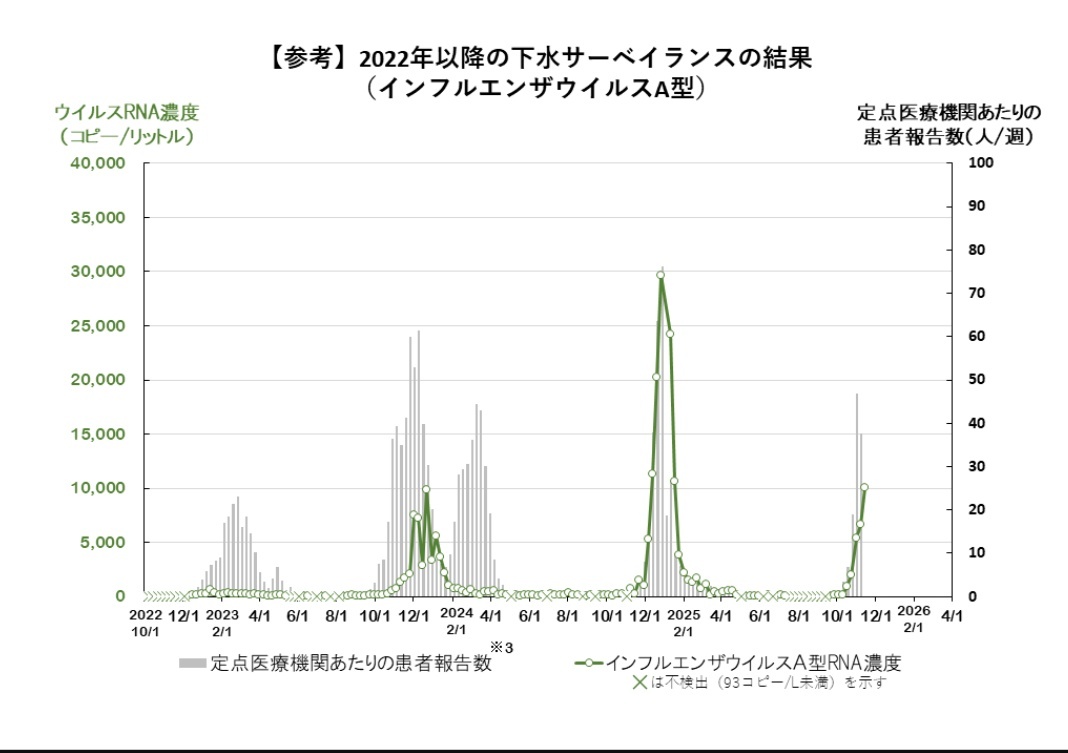 #インフルエンザ は5週連続で急上昇、#札幌市 はインフルエンザ警報発令中、学級閉鎖学年閉鎖だらけです! 昨年より1ヶ月以上早い流行、既に昨年末のピークの1/3まで来てるけどどこまで達するやら…今こそマスクと換気で予防を。#下水サーベイランス city.sapporo.jp/gesui/surveill…