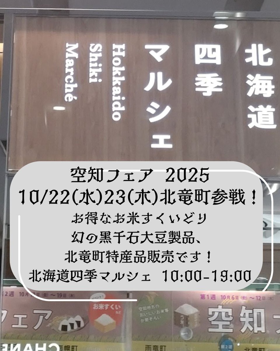 10/22(水) おは黒千石ジャー! 今日、明日は #札駅 #四季マルシェ 空知フェア2025 北竜町特産品販売 オトクな新米すくいどり開催デス! これから出勤しまーす! 黒千石製品の販売はもちろんですが 自家製の黒千石豆乳、黒千石きなこと米粉のスイーツ 「ひまわりんぐ」も販売です pic.x.com/9fFZqs2i5B