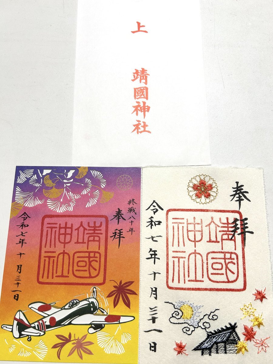 靖国神社の期間限定の朱印。 零戦朱印は画像では分かりにくいけど、レーザーカットでとても繊細。 (白い部分が抜き) 刺繍の朱印も美しい。布なので角4点に糊を貼るのが良いらしい。 #朱印 #御朱印 pic.x.com/g8pc67kzO3