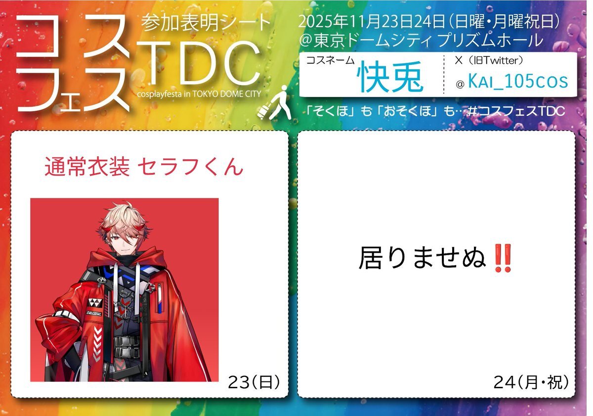 おはやうございます🌞 当日に参加表明とかいう意味わかんないことしてすんません‼️ 今日 #東京ドームシティ #コスプレフェスタTDC 参加です‼️ もしよければ会ってやってください🐇 pic.x.com/B4w1kX9n8w