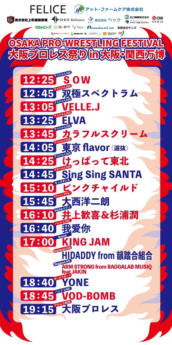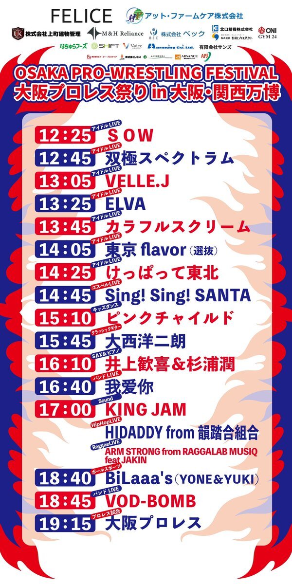 大阪プロレス祭りin 大阪•関西万博 で、カレッジフェスタコレクション LIVE FES 実施します。 タイテです。 12時25分〜 #sow 12時45分〜 #双極スペクトラム 13時05分〜 #VELLE.J 13時25分〜 #ELVA 13時45分〜 #カラフルスクリーム 14時05分〜 #東京flavor 14時25分〜 #けっぱって東北 pic.x.com/B8SKdEU3bg x.com/osakapro/statu…