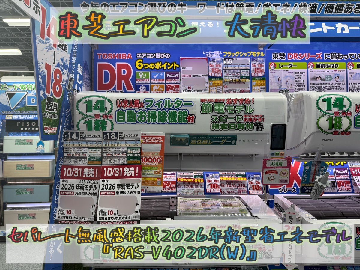 #東芝 『RAS-V402DR』登場/ 「セパレート無風感ルーバー」で、 左側は“無風感”、右側は“通常の風”など、 シーンに合わせて気流を自在にコントロール🥳 リビングなど広いお部屋におすすめです👍 10月下旬より発売予定✨ ぜひ5階エアコン売場まで💁 ➡yodobashi.com/product/200000… pic.x.com/knlpcoLZrw