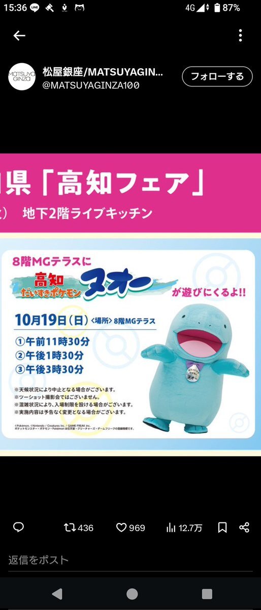松屋銀座から離脱、現在は帰路についてます😊 この時間は三両しか無い急行だから、隣に人が来て悲しい😭 今日は改めてヌオー人気を実感。 グリーティングに長蛇の列、2回目とかは無理そうだから早々の撤退は正解ですね。 ホントは娘に生で見せたかったけどね😅 #松屋銀座 #ヌオー #ポケモン pic.x.com/XEt36M2I5H