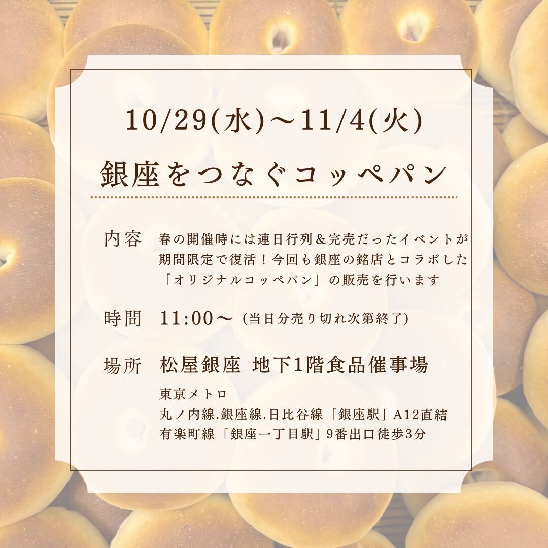 ⭐️ 10月催事情報のご案内⭐️ 10/29(水)〜11/4(火) ・松屋銀座「銀座をつなぐコッペパン」  詳細は画像をご覧ください (詳細は順次ポストします🍞) お近くにお越しの際は是非お気軽にお立ち寄りください! #催事情報 #銀座木村家 #松屋銀座 pic.x.com/YqwpCdPBmJ