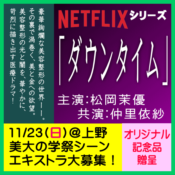🥁エキストラ募集◆Netflix医療ヒューマンドラマ「#ダウンタイム」最終公募 📅11/23(日)@東京(#上野) 美大学祭シーン 10代後半~70代男女250名大募集 tokyo.mport.info/ex/n20/invite/… 🌟#松岡茉優、#仲里依紗📢#YukiSaito監督(#アンメット)🖊美容整形の光と闇を描く! - 東京エキストラNOTES 11/18R pic.x.com/uyQsebKiIL