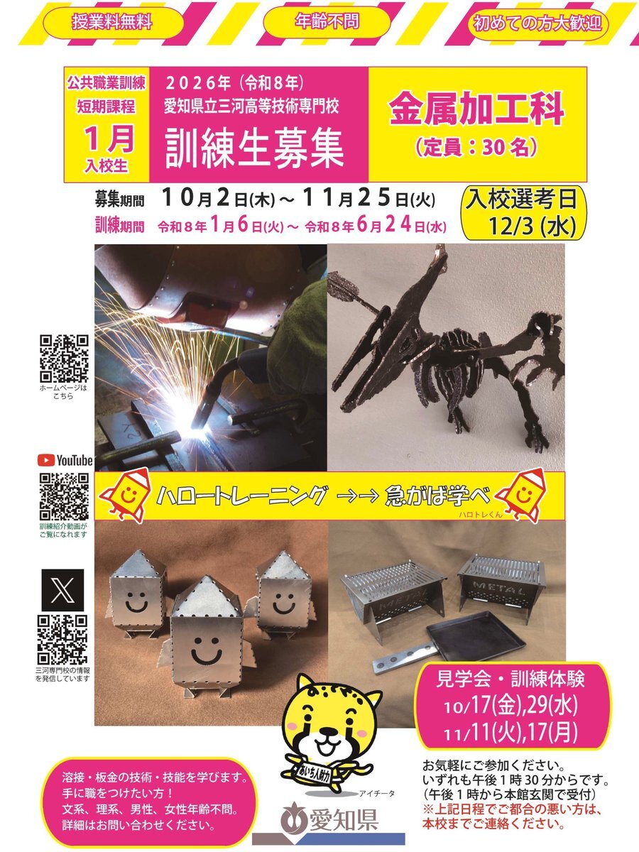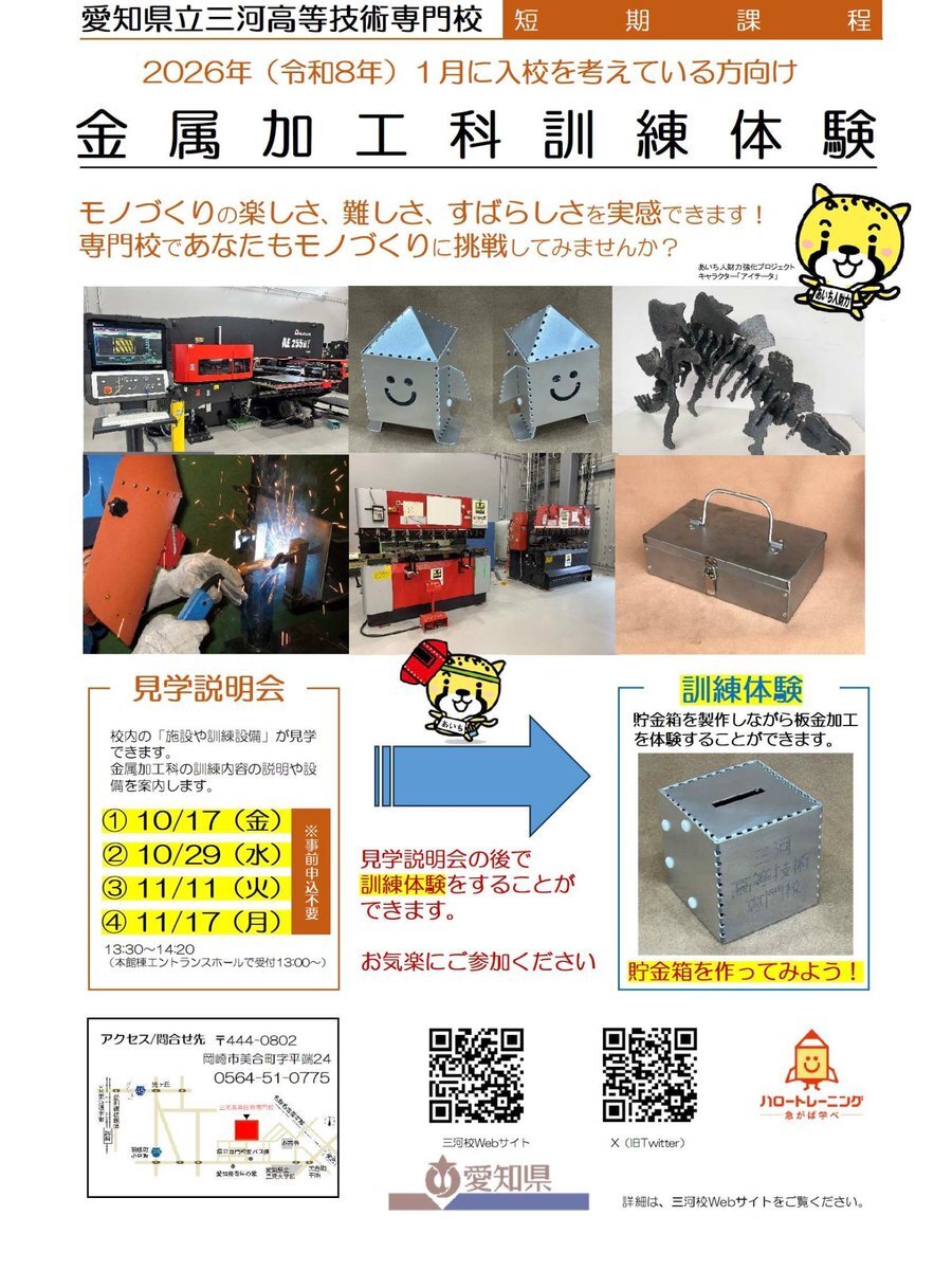 🔨金属加工科 募集締切前 最後の見学説明会!!🔨 📅11/17(月)13:30~ 🔥訓練内容等を指導員に直接質問できる 🔥訓練施設の見学ができる 🔥入校にあたっての相談ができる 見学説明会後に、貯金箱を製作しながら板金加工が体験できる訓練体験も実施します! 🔗aichivti.ac.jp/site/okazaki/m… #溶接 #板金 pic.x.com/DPotoctjwn