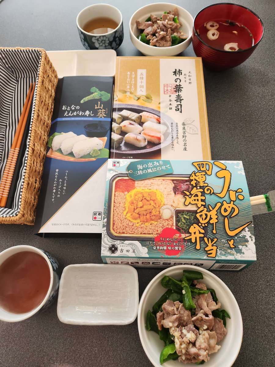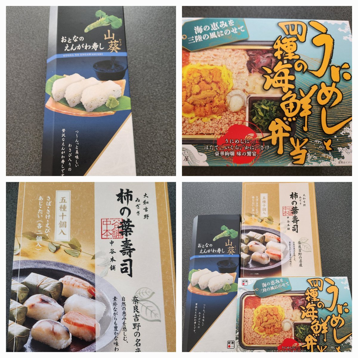 #駅弁 🍱 スーパーで駅弁祭りやってるよ~ってお知らせがきたので片道20分かけ三種類買う。 何種類もある中で無意識に何故か三種類海鮮駅弁を買ってた! #柿の葉寿司 #うにめしと四種の海鮮弁当 #山葵おとなのえんがわ寿司 それぞれ美味いがやっぱり私は柿の葉寿司が好みでした。 ※はい、自慢です pic.x.com/Di7mEQO7zo