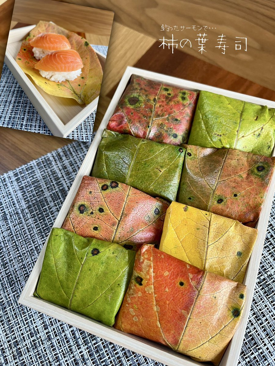 【釣ったサーモンで #柿の葉寿司 🍣】 秋らしく調理してみました👩🍳🍁 ↓ ①紅葉した柿の葉(渋柿)を、 よく洗い、塩水に漬けて冷蔵庫へ ②一晩漬けたら、 よく洗い、軸を削る ③サーモン寿司を握り、 葉で包んで箱に詰めたら完成 (鯖寿司も有名ですよね◎) ↓ さ! 寿司弁当を持って pic.x.com/UR81HK2xNx x.com/hitomi_otsuka_…