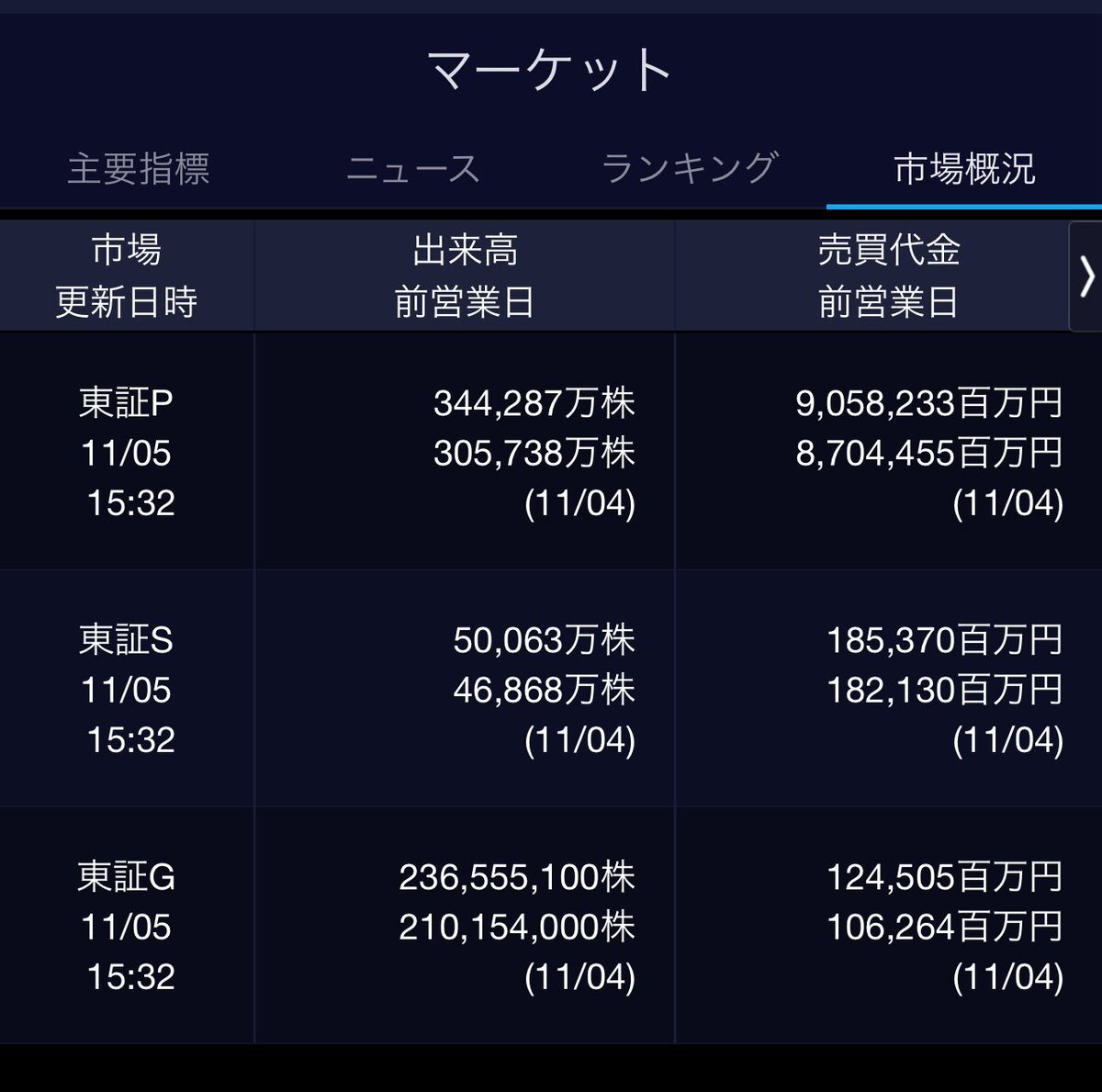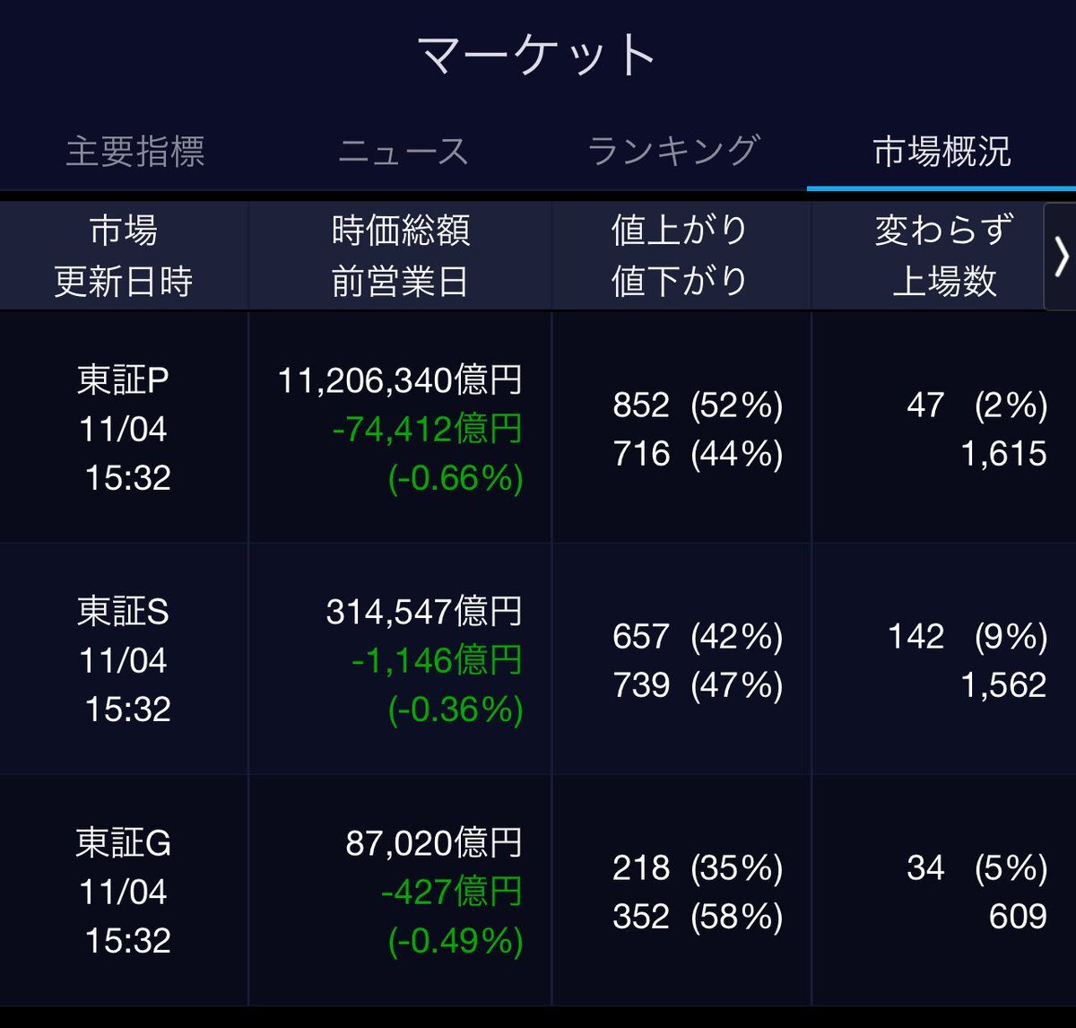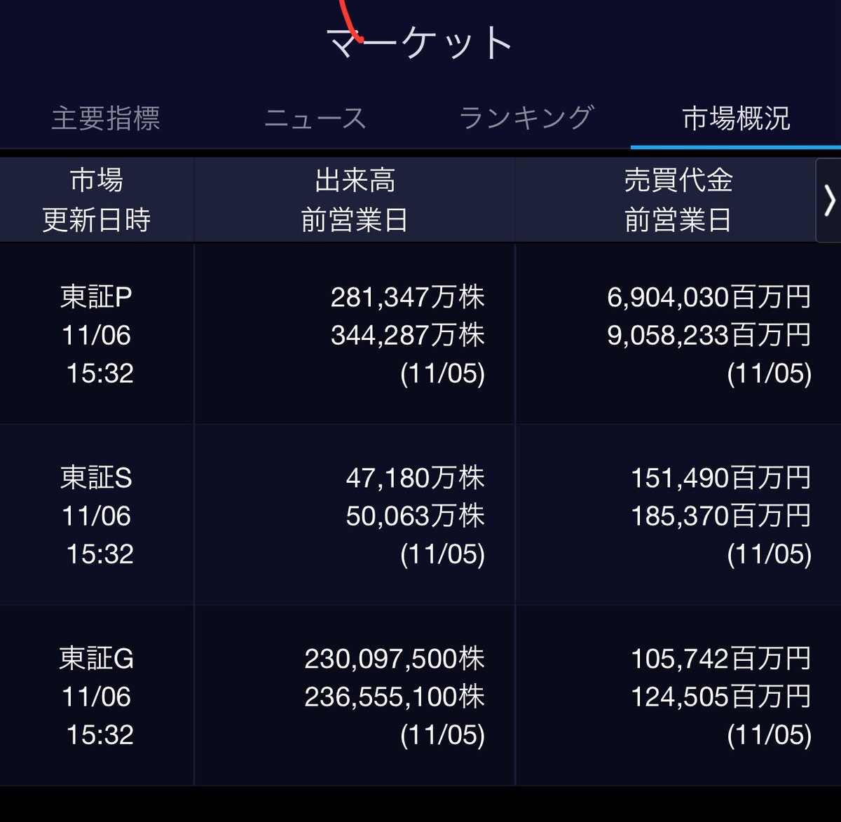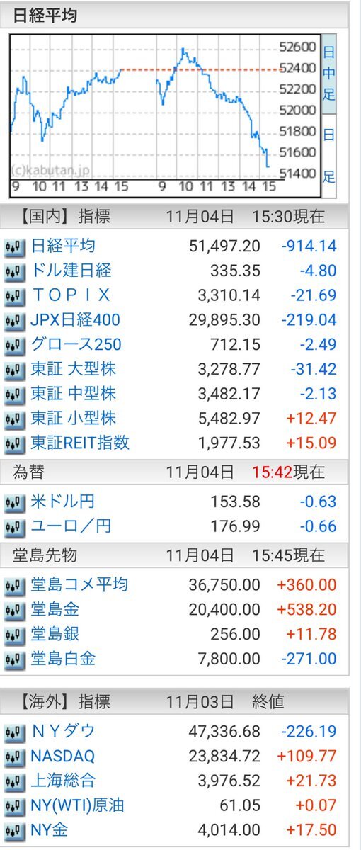 11/4(火)引け乙です🍁 🇯🇵NK 51,497.20🔹-914.14 TOPIX 3,310.14🔹-21.69 グロース 711.15🔹-2.49 🔶売買代金 🔼値上がり数% P🔸8,704,455百万円🔼52% S🔸 182,130百万円🔼42% G🔸 106,264百万円🔼35% 騰落レシオ95.86⬜️🟨🟨⬜️ #日本株 #株トレード #株式市場 pic.x.com/QNwj8pTCug
