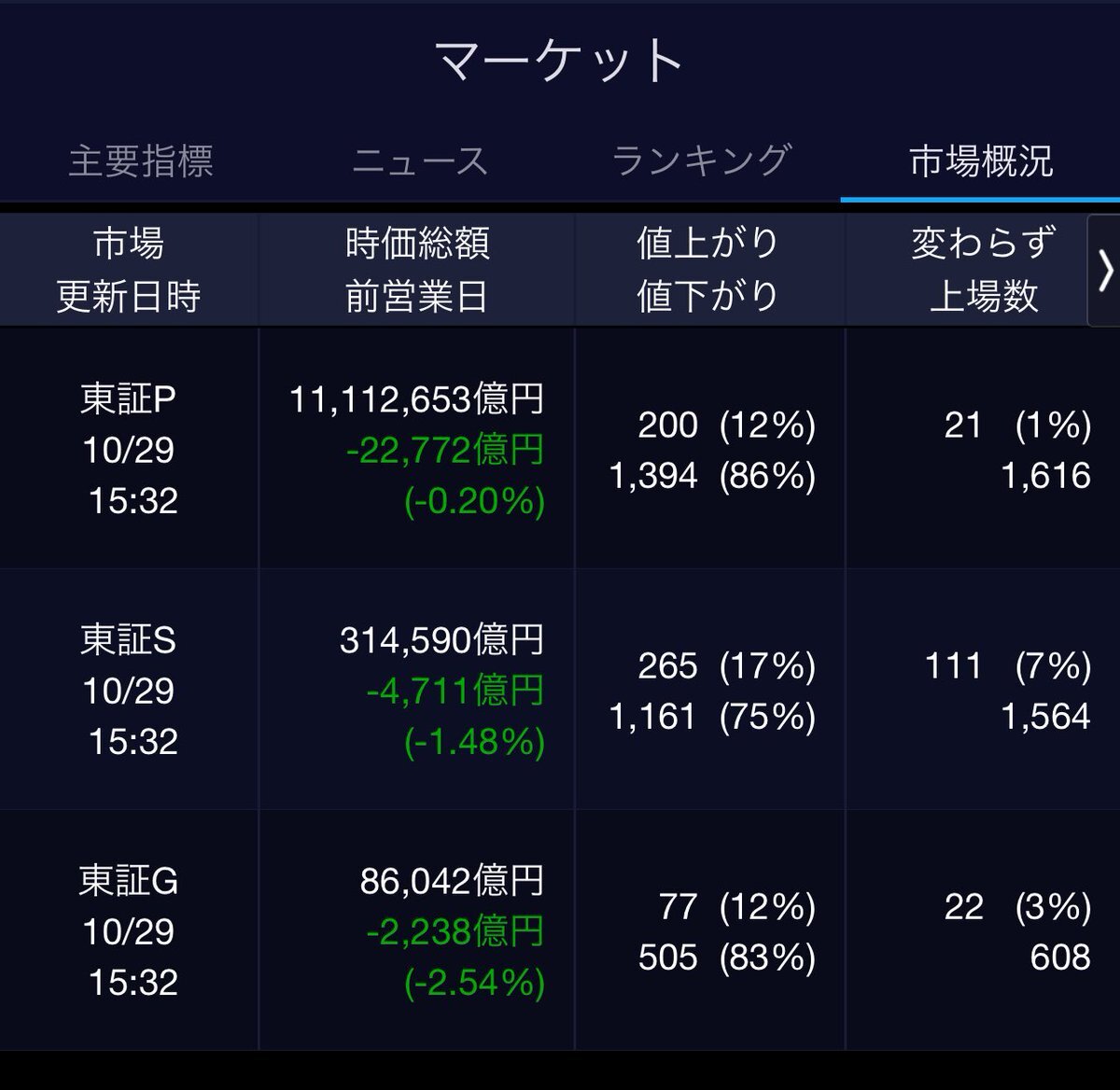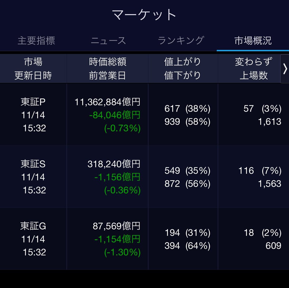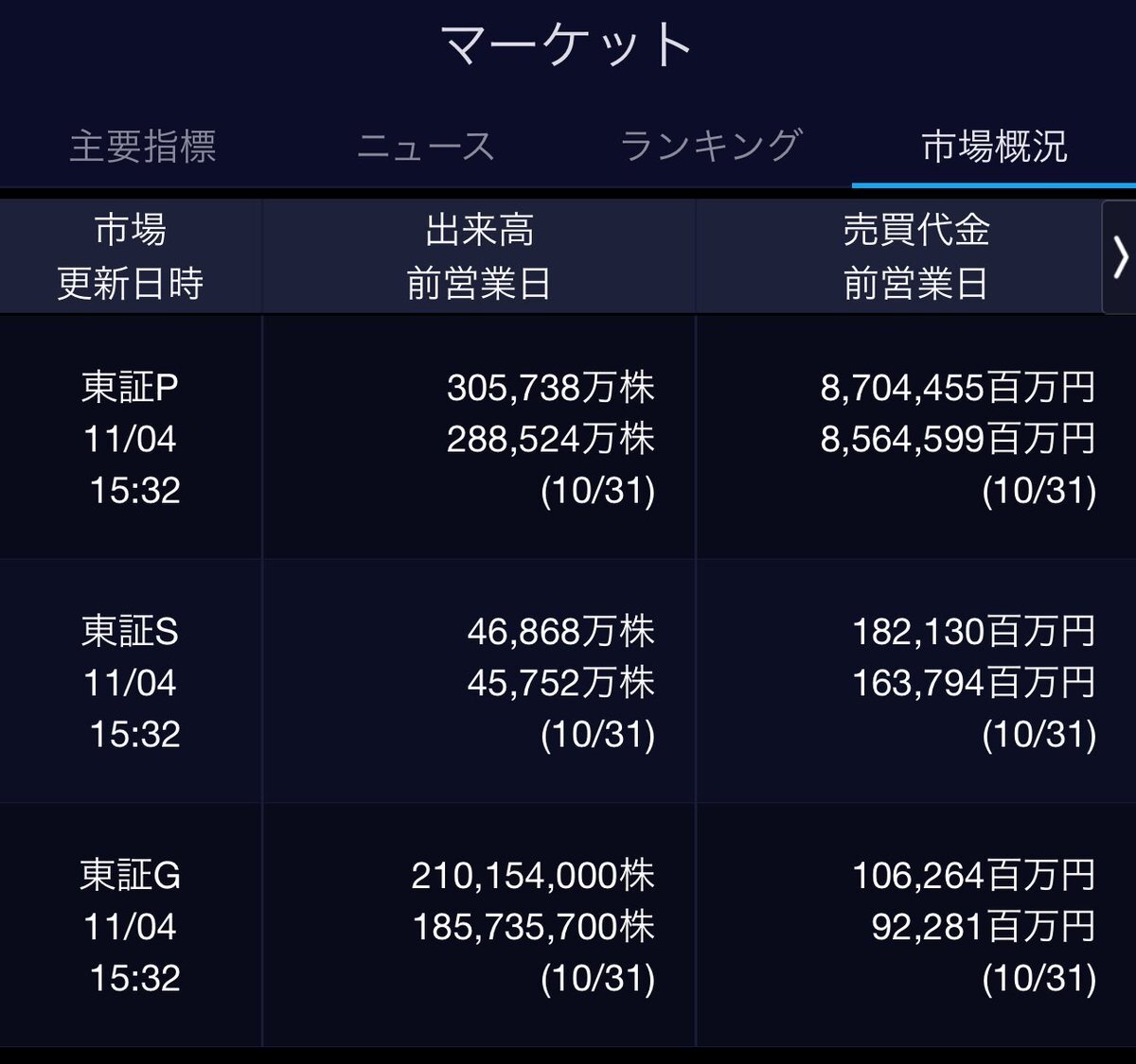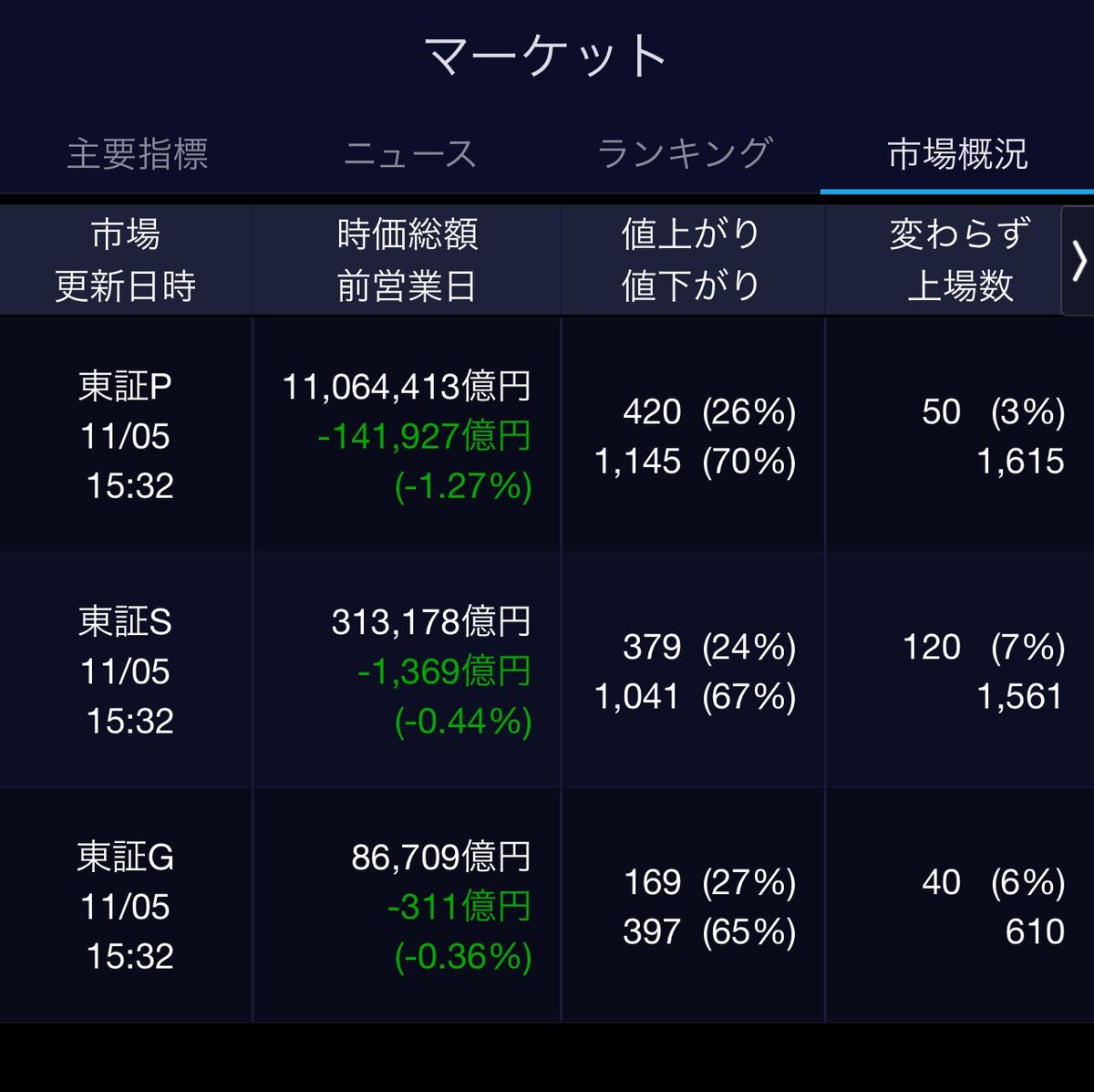 11/4(火)引け乙です🍁 🇯🇵NK 51,497.20🔹-914.14 TOPIX 3,310.14🔹-21.69 グロース 711.15🔹-2.49 🔶売買代金 🔼値上がり数% P🔸8,704,455百万円🔼52% S🔸 182,130百万円🔼42% G🔸 106,264百万円🔼35% 騰落レシオ95.86⬜️🟨🟨⬜️ #日本株 #株トレード #株式市場 pic.x.com/QNwj8pTCug