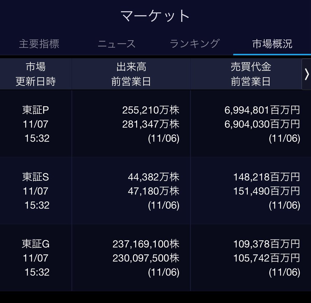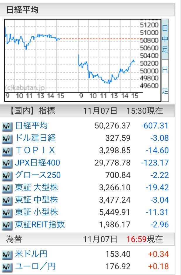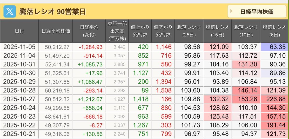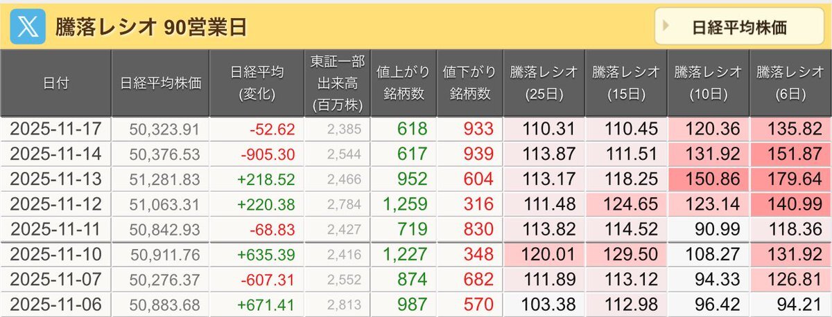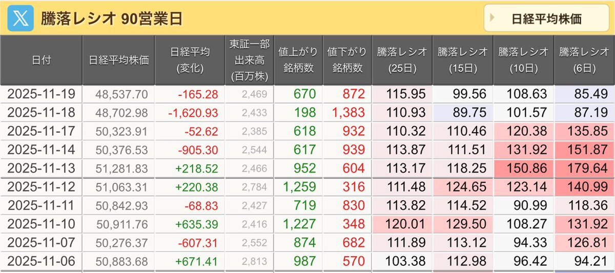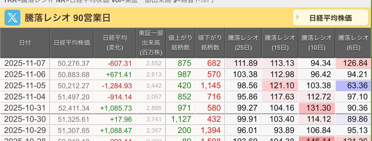 11/7(金)引け乙です🍁 🇯🇵NK 50,276.37🔹-607.31 TOPIX 3,298.85🔹-14.60 グロース 700.84🔹-2.22 🔶売買代金 🔼値上がり数% P🔸6,994,801百万円🔼3% S🔸 148,218百万円🔼35% G🔸 109,378百万円🔼39% 騰落レシオ111.89🟨🟨⬜️🟧 #日本株 #株トレード #株式市場 pic.x.com/f6uon6cOXF
