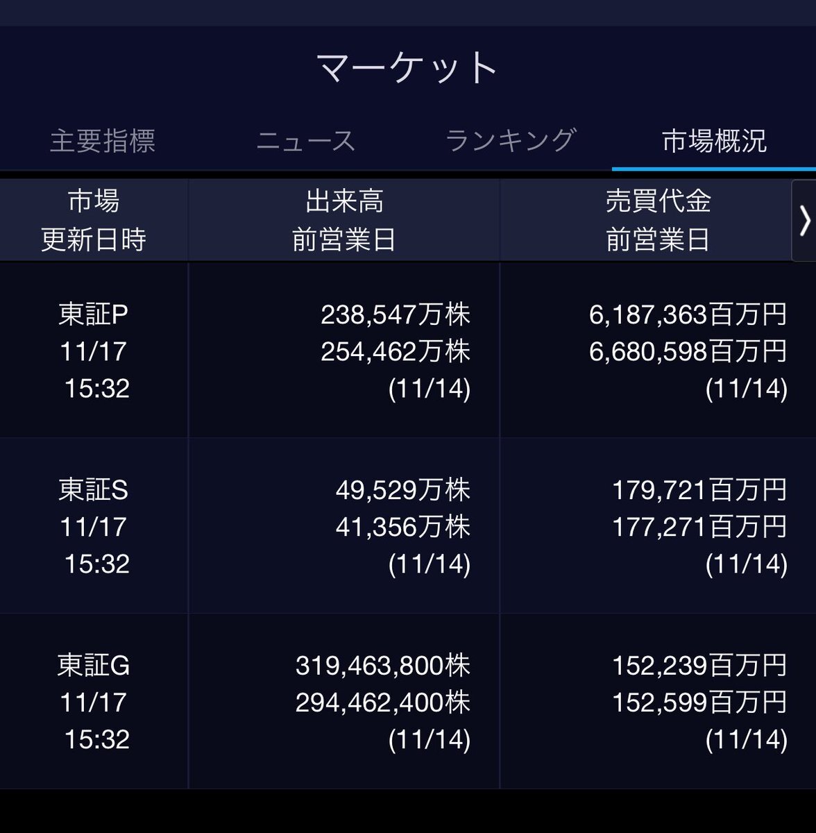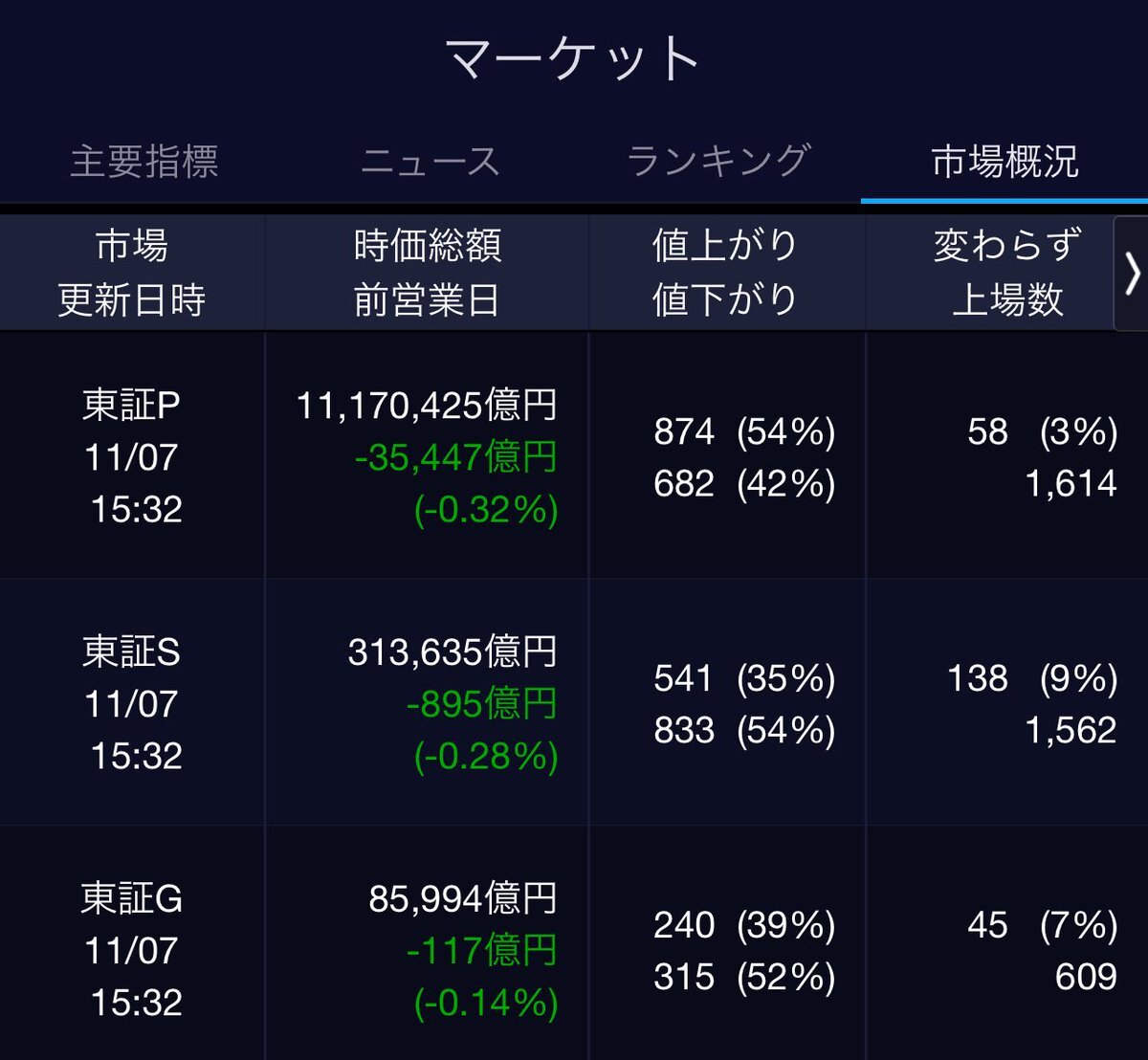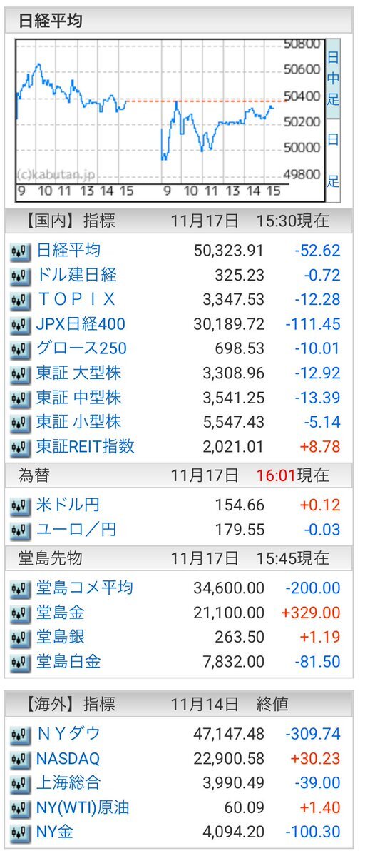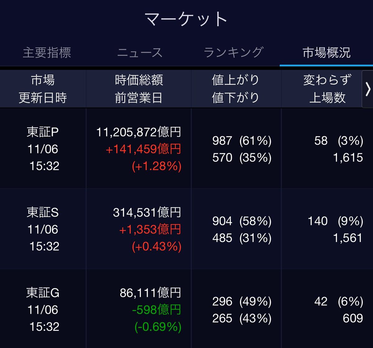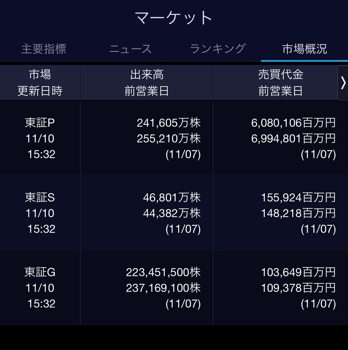 11/7(金)引け乙です🍁 🇯🇵NK 50,276.37🔹-607.31 TOPIX 3,298.85🔹-14.60 グロース 700.84🔹-2.22 🔶売買代金 🔼値上がり数% P🔸6,994,801百万円🔼3% S🔸 148,218百万円🔼35% G🔸 109,378百万円🔼39% 騰落レシオ111.89🟨🟨⬜️🟧 #日本株 #株トレード #株式市場 pic.x.com/f6uon6cOXF