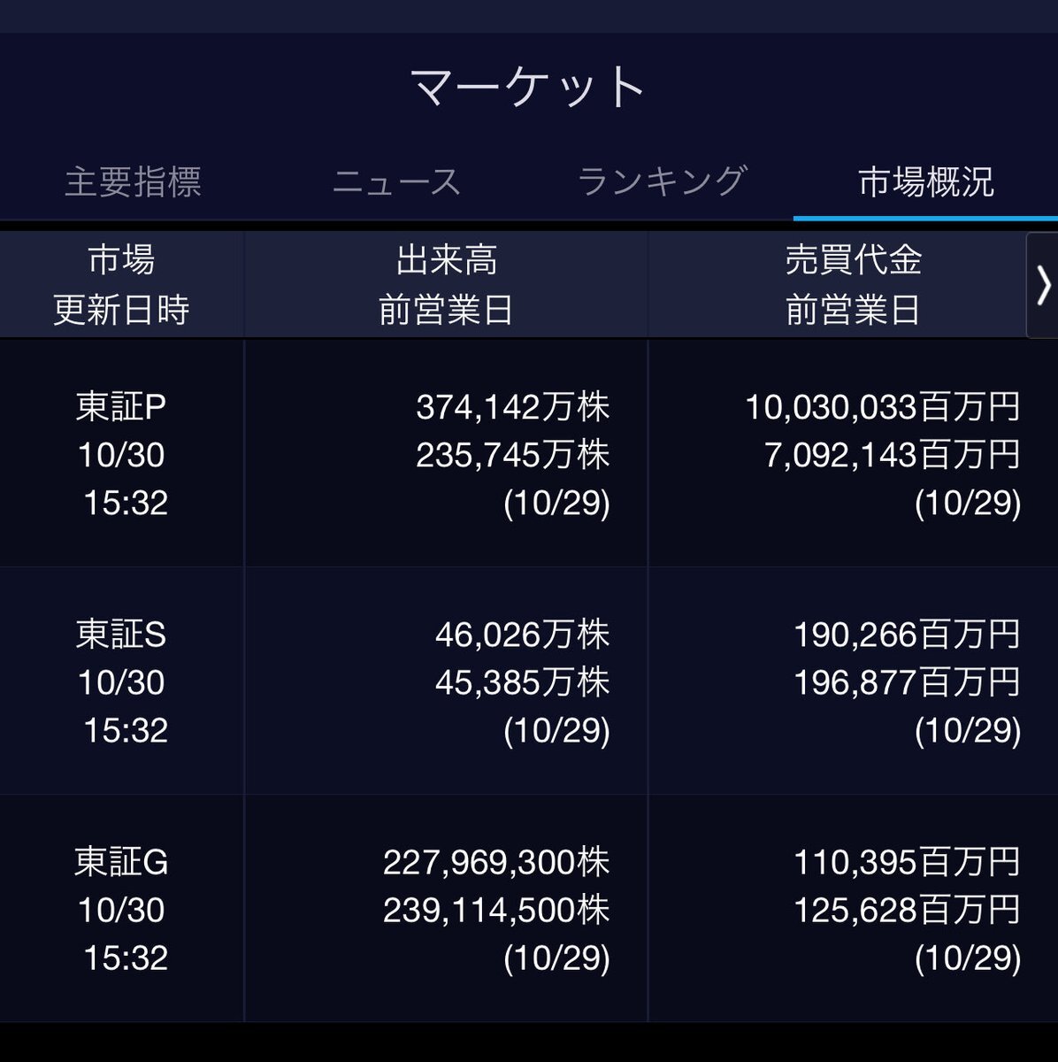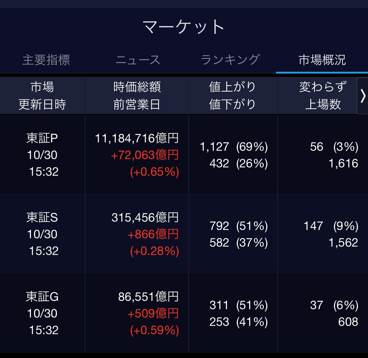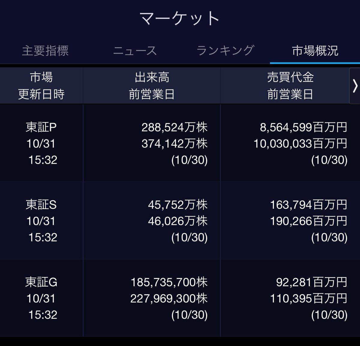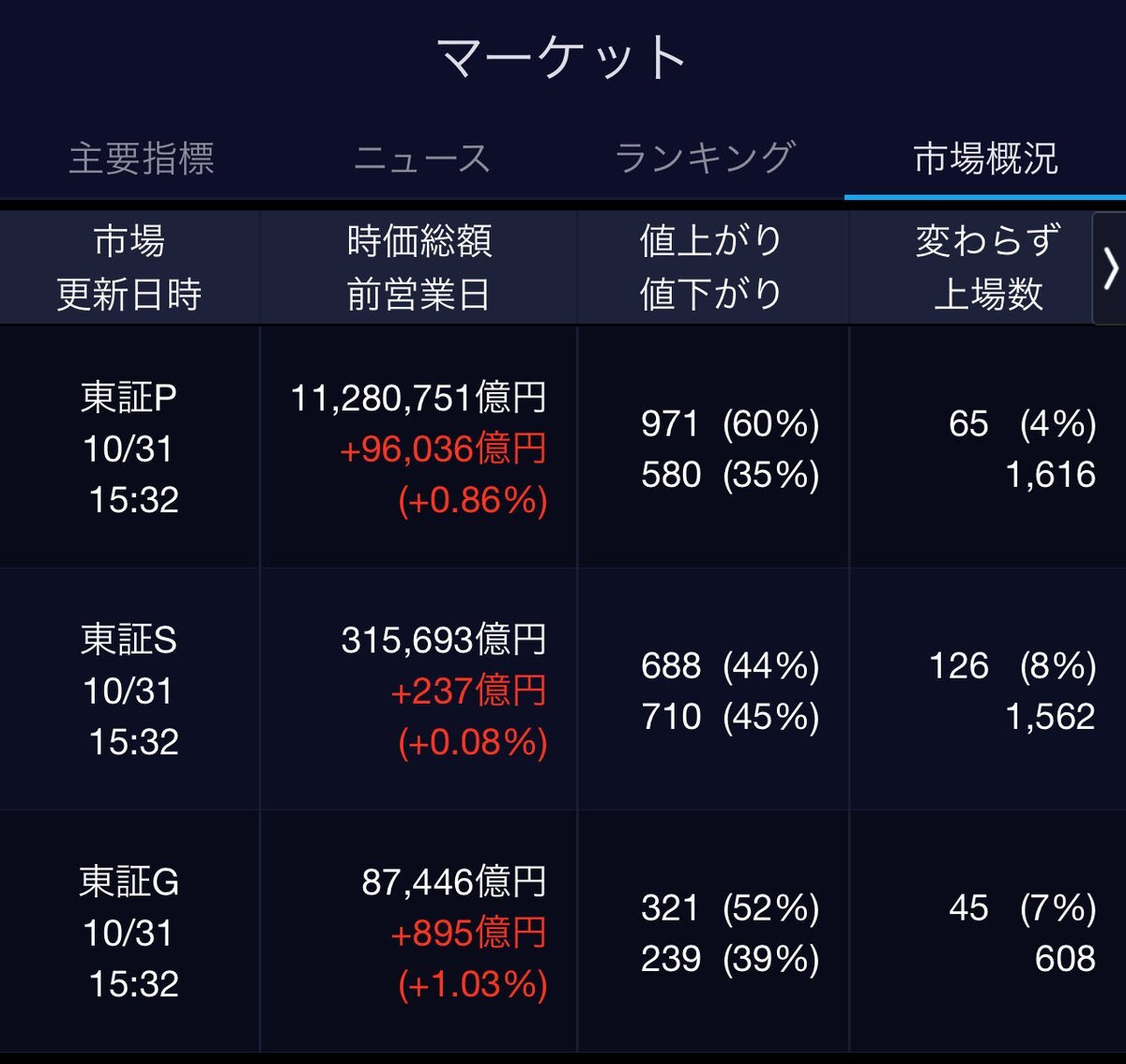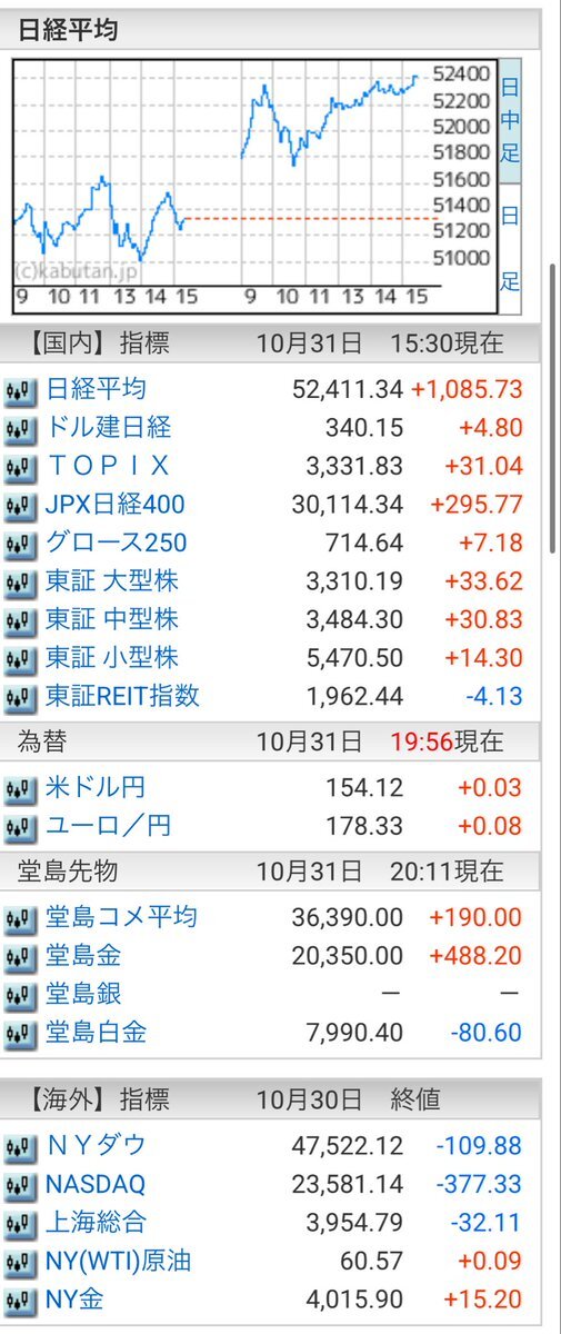 10/31(金)引け乙です🎃 🇯🇵NK 52,411.34🔺+1085.73 TOPIX 3,331.83🔺+31.04 グロース 714.64🔺+7.18 🔶売買代金 🔼値上がり数% P🔸8,564,599百万円🔼60% S🔸 163,704百万円🔼44% G🔸 92,281百万円🔼52% 騰落レシオ99.27⬜️⬜️🟧⬜️ #日本株 #株トレード #株式市場 pic.x.com/UjMOKgu5ED