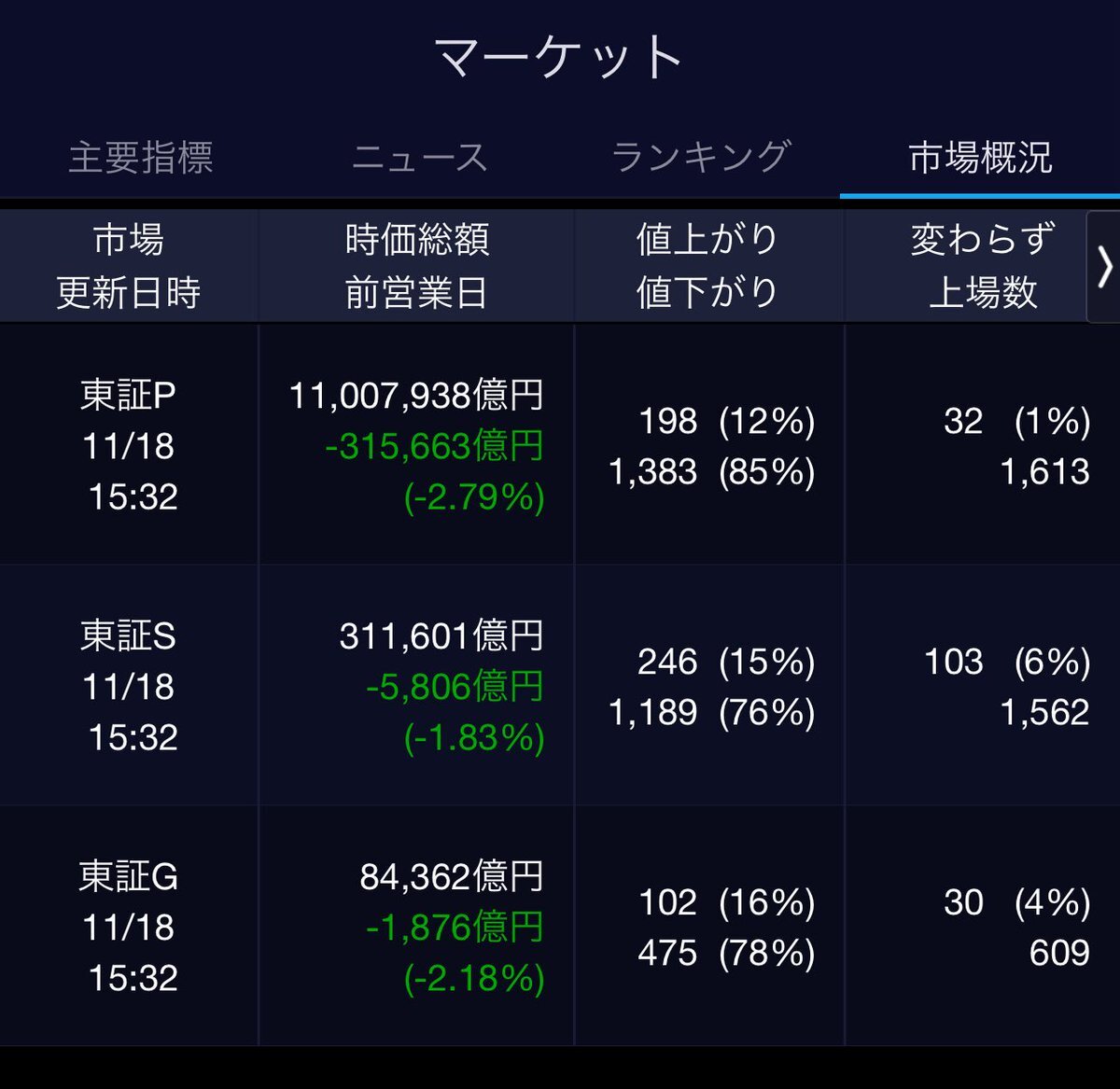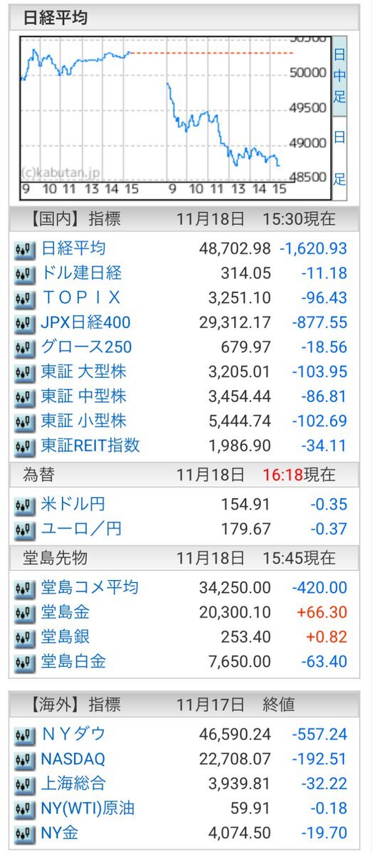 11/18(火)引け乙です🍁 🇯🇵NK 48,702.98🔹-1620.93 TOPIX 3,251.10🔹-96.43 グロース 679.97🔹-18.56 🔶売買代金 🔼値上がり数% P🔸6,462,740百万円🔼12% S🔸 173,857百万円🔼15% G🔸 145,250百万円🔼16% 騰落レシオ110.93⬜️⬜️⬜️⬜️ #日本株 #株トレード #株式市場 pic.x.com/t4nyLUDce1