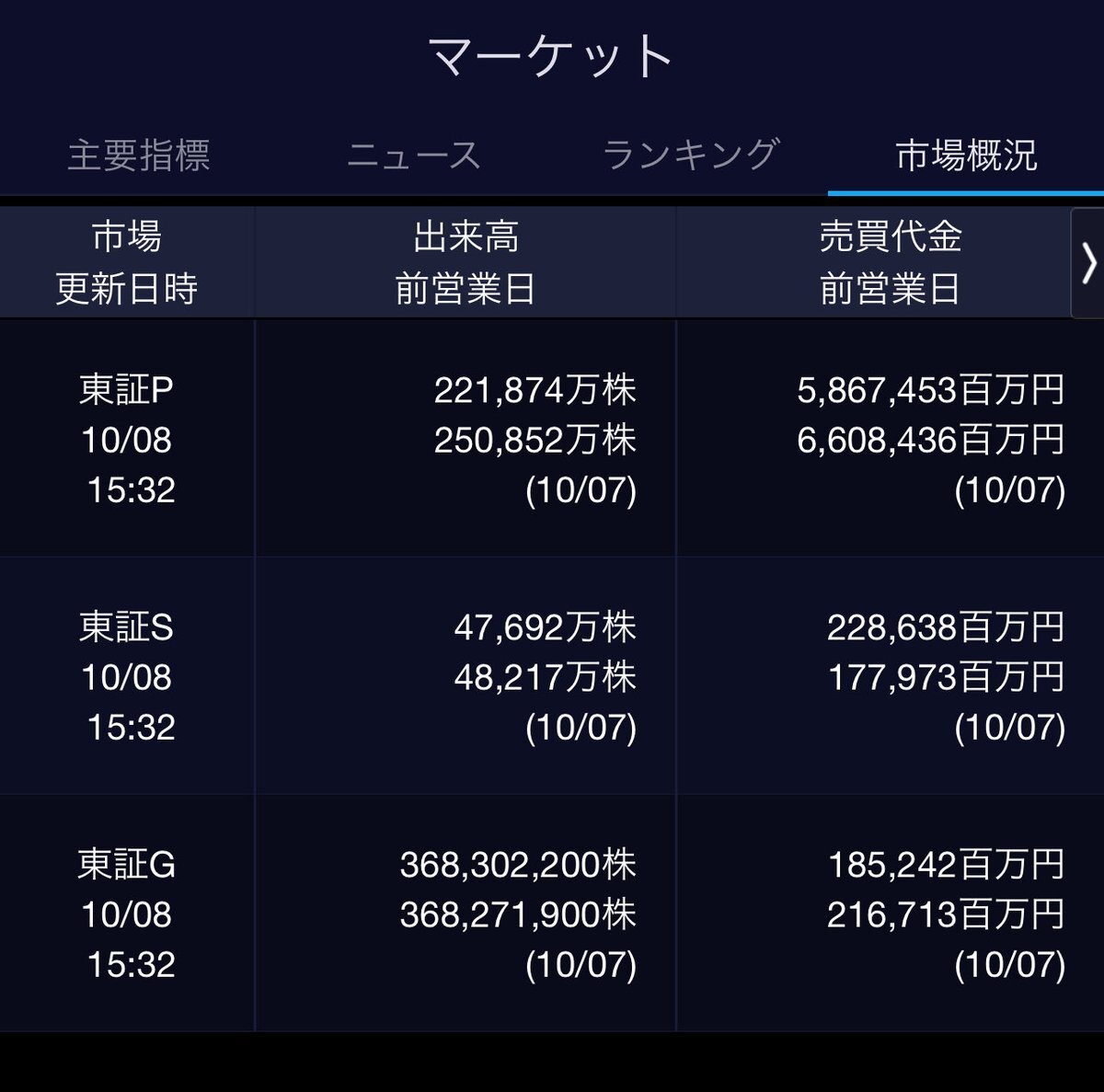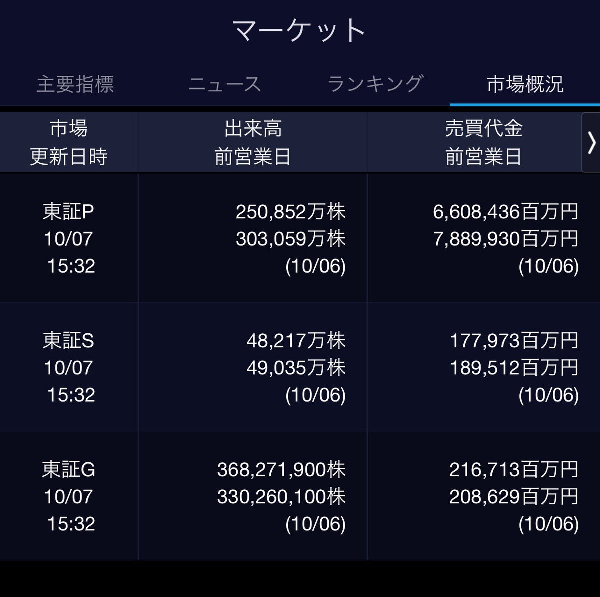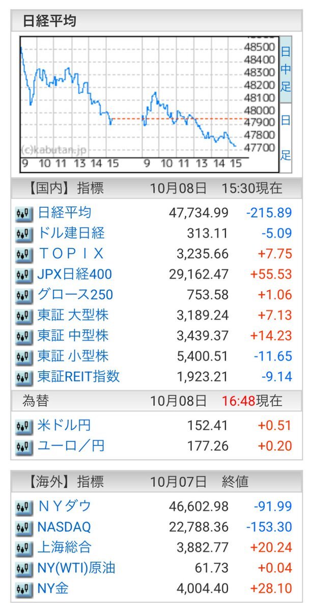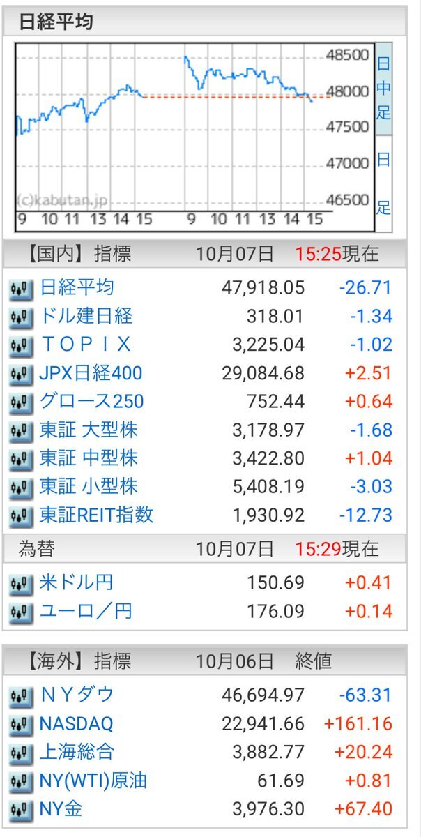 10/7(火)引け乙です🍄 🇯🇵NK 47,918.05🔹-26.71 TOPIX 3,225.04🔹-1.02 グロース 752.44🔺+0.64 🔶売買代金 🔼値上がり数% P🔸6,608,436百万円🔼49% S🔸 177,973百万円🔼42% G🔸 216,713百万円🔼43% 騰落レシオ111.27⬜️⬜️⬜️⬜️ #日本株 #株トレード #株式市場 pic.x.com/BPvS4zZnd4