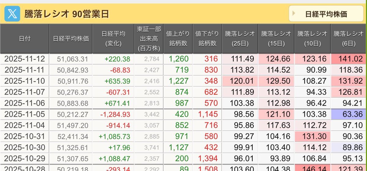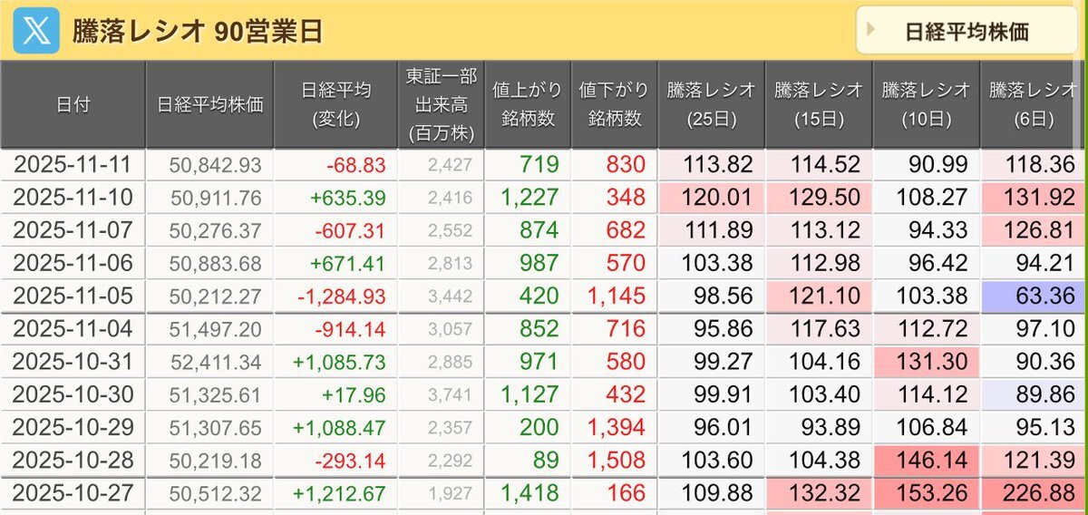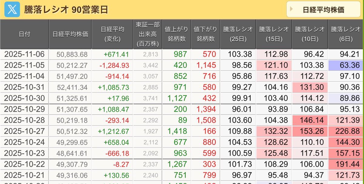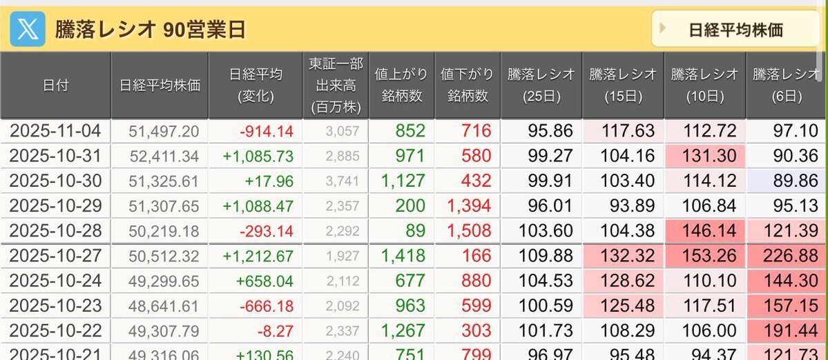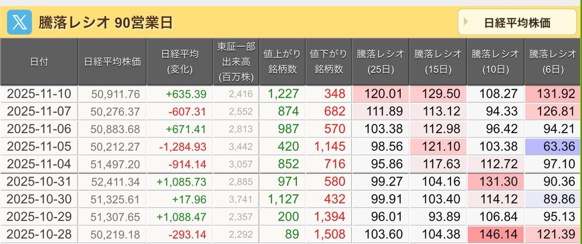 11/10(月)引け乙です🍁 🇯🇵NK 50,911.76🔺+635.39 TOPIX 3,317.42🔺+18.57 グロース 712.72🔺+11.88 🔶売買代金 🔼値上がり数% P🔸6,080,106百万円🔼76% S🔸 155,924百万円🔼64% G🔸 103,649百万円🔼70% 騰落レシオ120.01🟧🟧⬜️🟧 #日本株 #株トレード #株式市場 pic.x.com/VgePCx0Uws