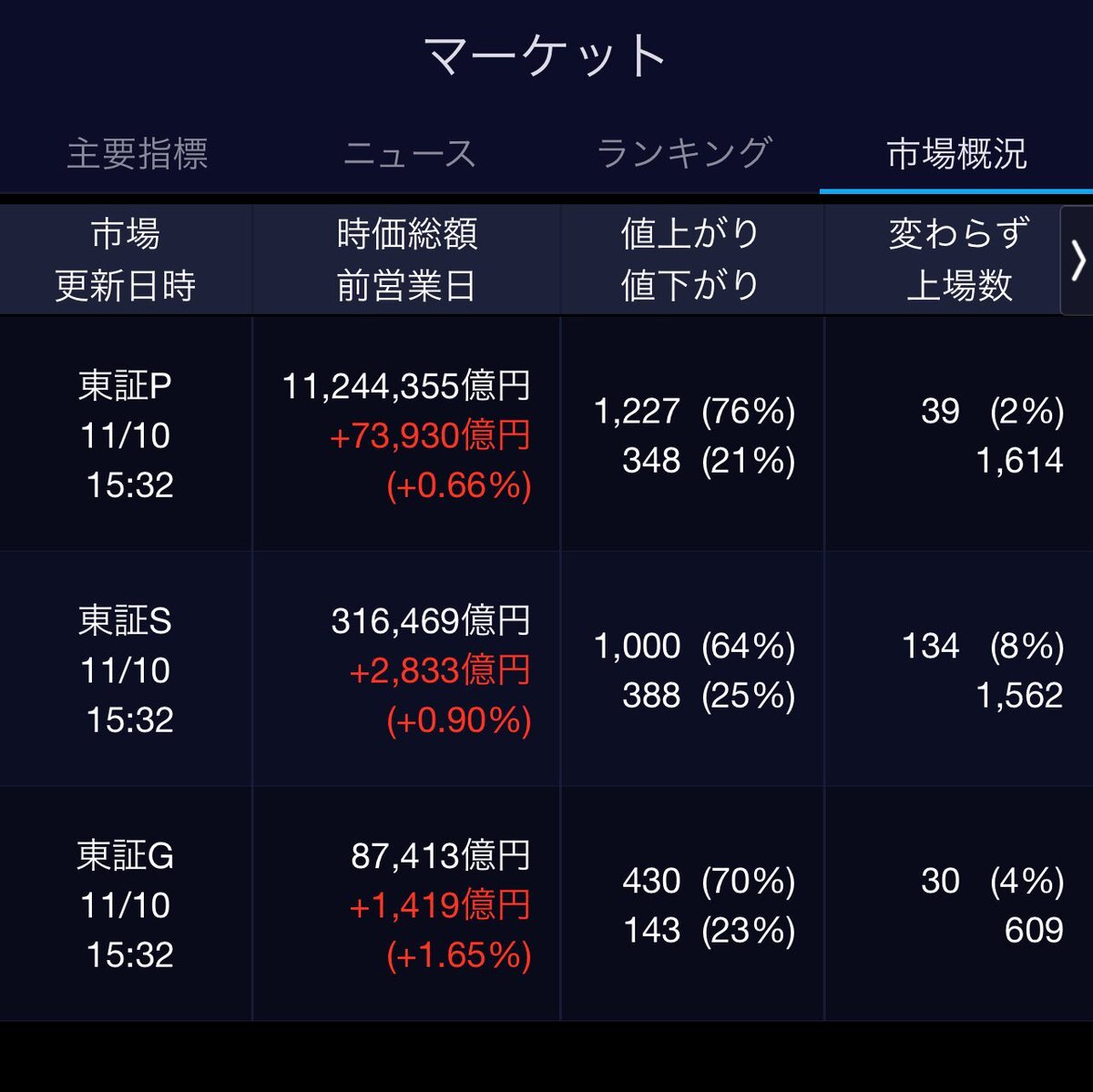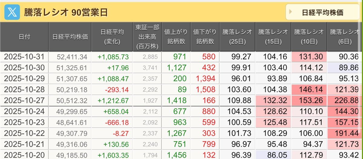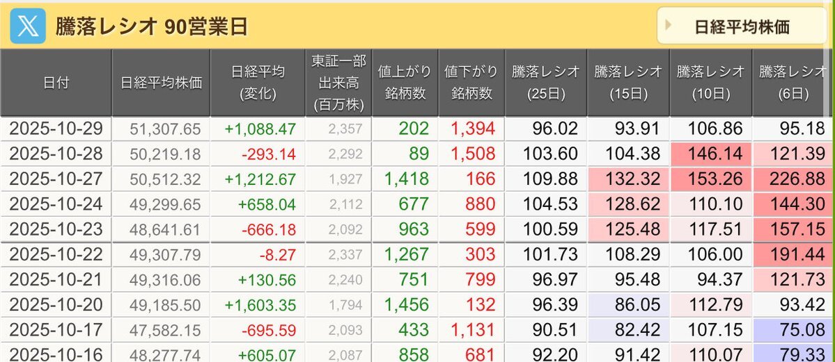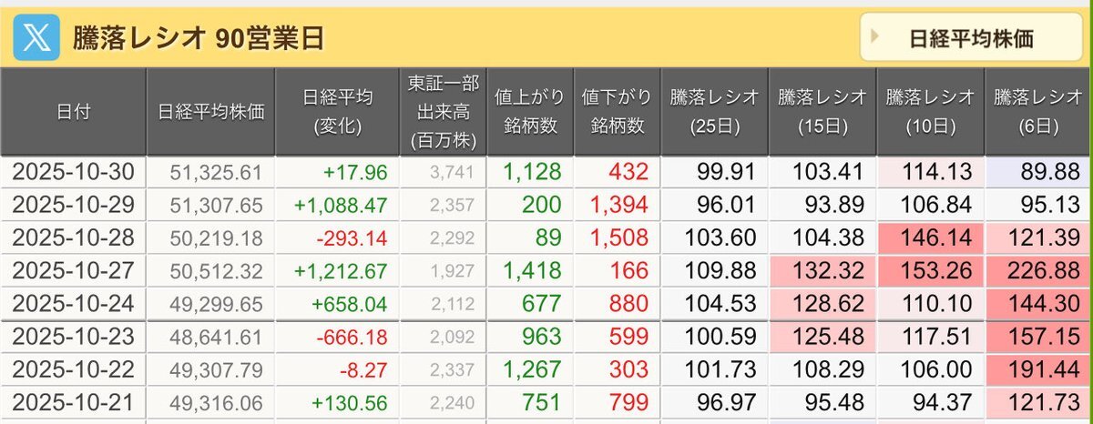 11/10(月)引け乙です🍁 🇯🇵NK 50,911.76🔺+635.39 TOPIX 3,317.42🔺+18.57 グロース 712.72🔺+11.88 🔶売買代金 🔼値上がり数% P🔸6,080,106百万円🔼76% S🔸 155,924百万円🔼64% G🔸 103,649百万円🔼70% 騰落レシオ120.01🟧🟧⬜️🟧 #日本株 #株トレード #株式市場 pic.x.com/VgePCx0Uws